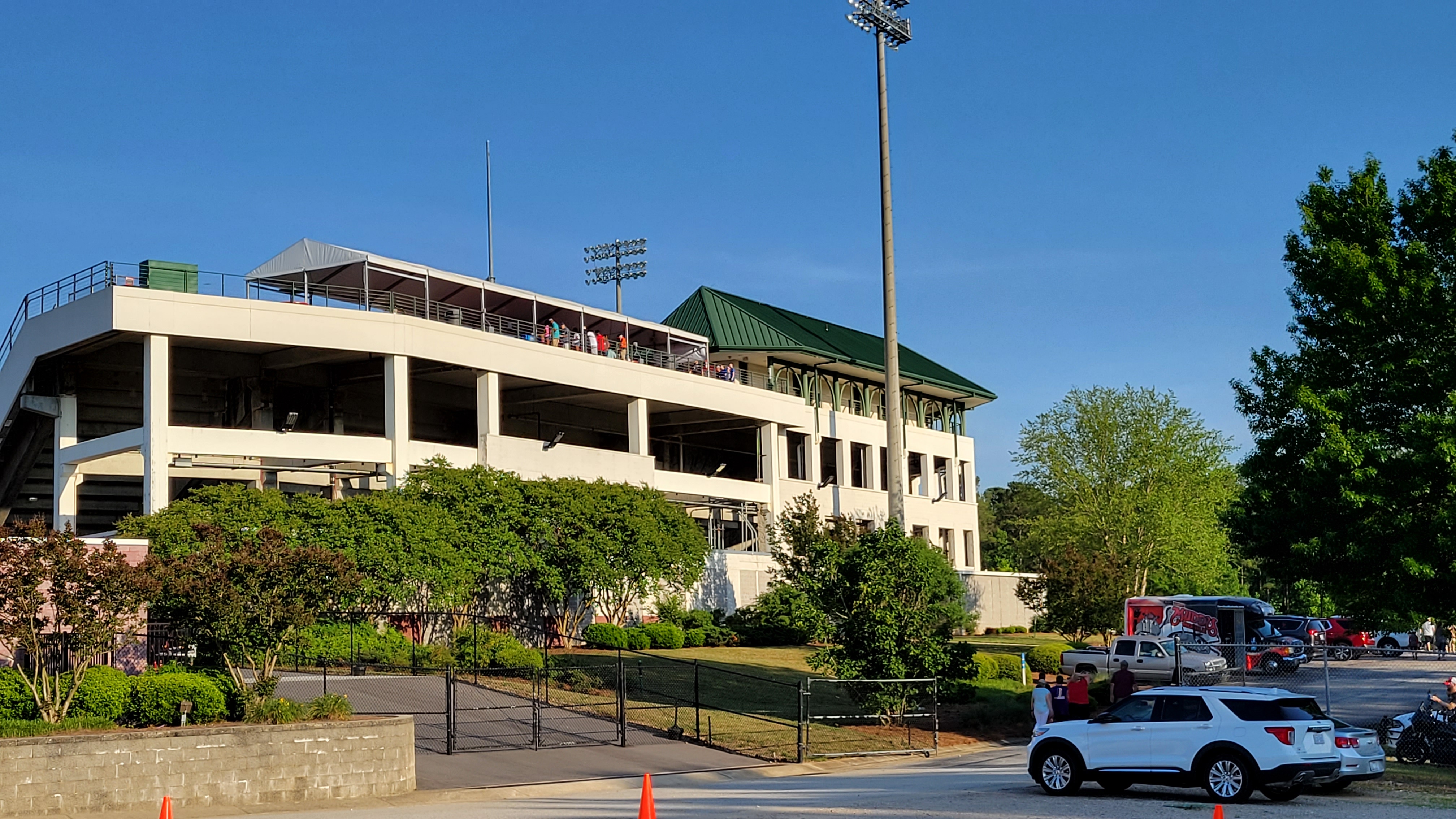 Five County Stadium is different in a good way as the main seating around the infield is an upper deck of sorts with the first row starting 20 feet off the ground. This leads to a great perspective and sightlines are even better as you go higher thanks to a seating bowl that is at a steep angle. 12-14 rows make up each section of red chairs, which are spacious and generally comfortable. The only obstruction I found was in the first row as the railing gets in the way of the field. Also, because the shape is not curved (rather done like this: \_/), Sections 209 and 212 are pointed down foul territory at a somewhat awkward viewing point. Underneath this primary deck is another area of seating as 5-6 rows of field-level sections surround the field, extending down the line halfway into the outfield. This is intimate thanks to the overhang and nearness to the ground and unique dugouts that seem to be almost in the seats. It is the best area to perhaps seek some shade during day games as the lack of cover elsewhere is disappointing. There are also two sets of bleachers beyond the bowl, which do at least feature green chairs on the aluminum base. These sections feel unnecessary. Luxury seating is done well as behind the top row is a set of luxury suites, bookended by an indoor lounge and picnic party pavilion. The left field corner also features a group space option. As for the view, it is rather unassuming in the outfield, except for one key feature. It’s the water tower in left, which is synonymous with the image of Five County Stadium. It is designed as a baseball with the seams and team script, while “Zebulon” is written vertically down the pole.