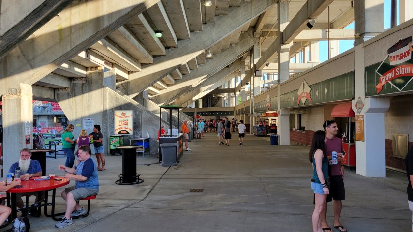 There is a lot of concrete and gray color in the concourse as the covered area is framed by the underside of the stairs that go up the seating bowl. Walking space is average and while a packed house would make for an uncomfortable time around here, that won’t be the case when attending a game. Even though there are stairs (and a lot of them) to get to the main seating, sections of the field are viewable from the concourse and there’s a few spots where they’ve put tables. Overall, it’s old but adequate. Once the concourse ends near each base, it opens up to the outside with walkways to the bleachers.