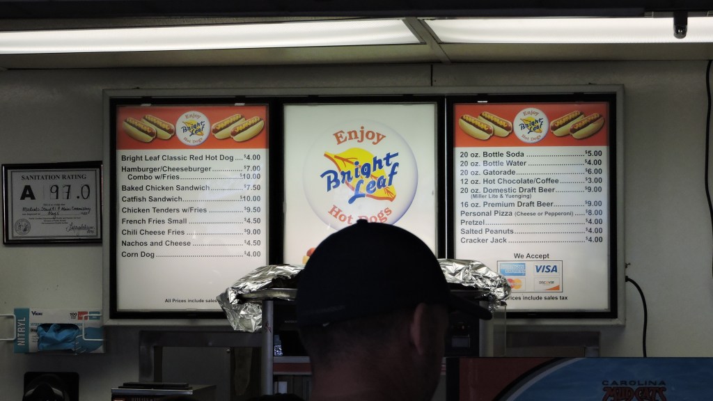 Tickets are $12 – $16 and that’s about what I would expect for the Mudcats and comparable with other nearby Carolina League teams. Parking though is $5. Food prices are ok with a Hot Dog costing $4 and a Cheeseburger running $7. Beer was on the high side with a minimum charge of $9.