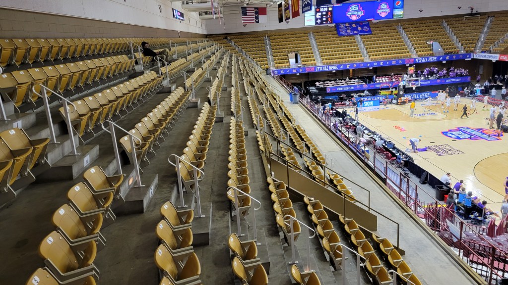 What makes this arena really unique is that the majority of seats are on an upper deck and I love that. The elevated vantage point makes for great sightlines while still feeling close to the court. The rows are pitched at a steep level and that helps too. One downfall though is that there is a wide walkway in front of the first row. This means you can have people walking by, plus a railing gets in the way of the court view despite the elevated platform of the first couple rows. Chairs are wide enough in spite of the mustard coloring which makes it feel like they’re original to the 1970s. The arena design is a rectangle with curved corner sections. As you get towards the end of the sidelines, views aren’t the best since the Civic Center originality means a lot of floor space behind the court. Down at court level, there are differences at each end, which seems a bit odd as it means disparities in student section size. One end features a natural progression and meet up with the upper deck, while the other end has the Courtside Club, a social section enhanced with the usual amenities. The band plus a much smaller student area sits behind that. The maroon seats on the sideline sections are unique here with this first level because they have a confined feel given the overhanging ceiling of the upper deck within touching distance. Harrah’s Cherokee Center is well lit and has a good look on TV as well. I’m all for sporting venues that stand out and this is certainly one of those.