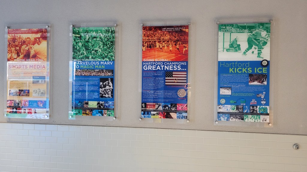 The corporate influence is annoying. See above, where a big Dunkin’ cup sits on top of the scoreboard. Then on top of The Hartford Terrace, you don’t have a big Goat on there, instead a large Stag because that is the logo for the insurance company. At least it’s a good looking deer. Given that the franchise doesn’t outwardly recognize New Britain history, the team can’t be blamed for a lack of history or championship displays. I was content that they made up for it in other ways. Namely, the back of the press box wall has eight info posters that detail a wide (and I mean wide) variety of Hartford sports. Other highlights include a huge poster of the 1922 Hartford Eastern League team and a whole bunch of logos and team-oriented creations that adorn the walls.