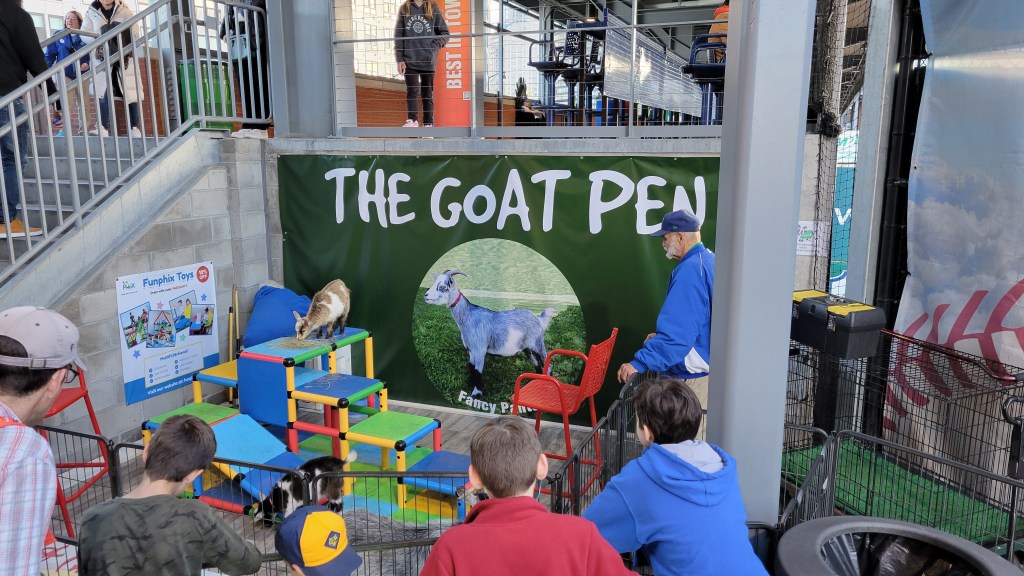 The opening entrance is an unusual introduction as you arrive in the right-field corner. This space is framed by a decorative wall and the ballpark structure ahead. It’s tight as everyone files in, while the covered concourse ahead is average in space for a Double-A ballpark. The lack of an open area to congregate means that several portions of the concourse will get crowded. Lines can get long for food, so there will be times you need to cut through to make space. The concourse is open to the field as handicap / standing sections start close enough to the bowl for it not to be an intrusion. I really like the color scheme as blue/green signage goes well with gray floors and ceilings. Another cool touch are the windows to the production area, allowing fans to get a peek at how the behind-the-scenes video works. A ramp and walkway go around the outfield to provide access to the many seating sections out here, while the final walkway underneath the right-field upper deck provides a neat perspective that feels old school. Don’t miss “The Goat Pen” near this area as the baby goats are huge hit (especially with the kids).