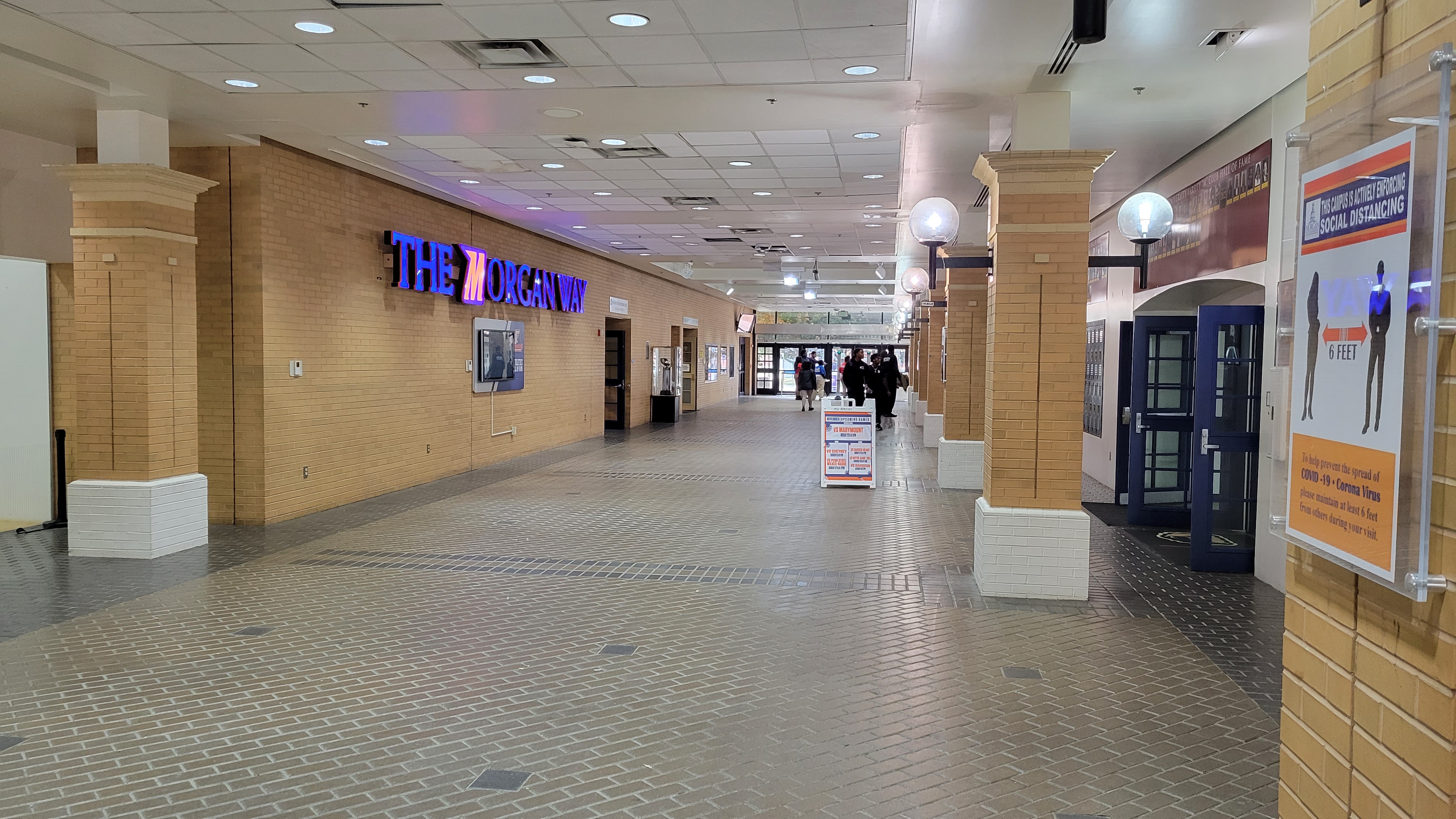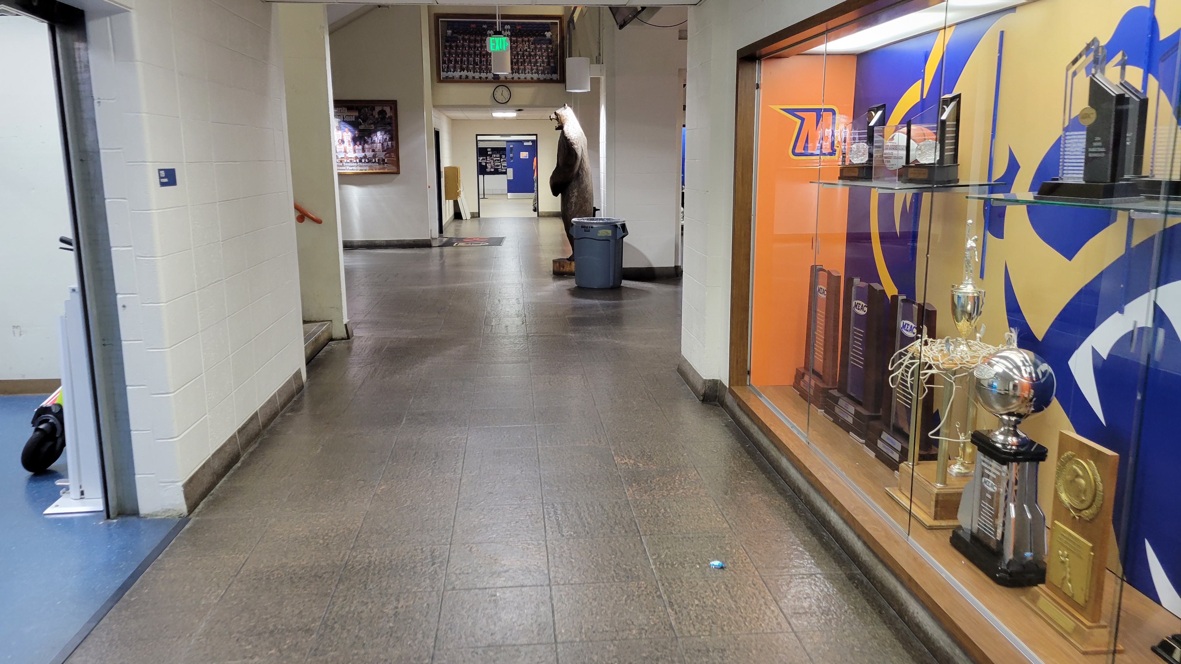 Each entrance leads right into a hallway that is an interesting mix of old and new. You have concrete flooring designed to look like bricks and there are lockers on the side wall. Yet the new is a catchy “The Morgan Way” sign and streetlamp like lighting on the side. It’s a unique vibe. There’s plenty of room inside the gymnasium, especially behind the baskets and there is also a “concourse” on one of the sides. As you enter through a corner (watch out for the players walking to the locker room), a somewhat narrow hallway opens up at the center, where you can find the lone concession stand. This is also where you need to go if you want to enter the upper seating sections. While plenty of nice team displays make it look good, there are also remaining features that date the building. This includes payphones and a wall analog clock.