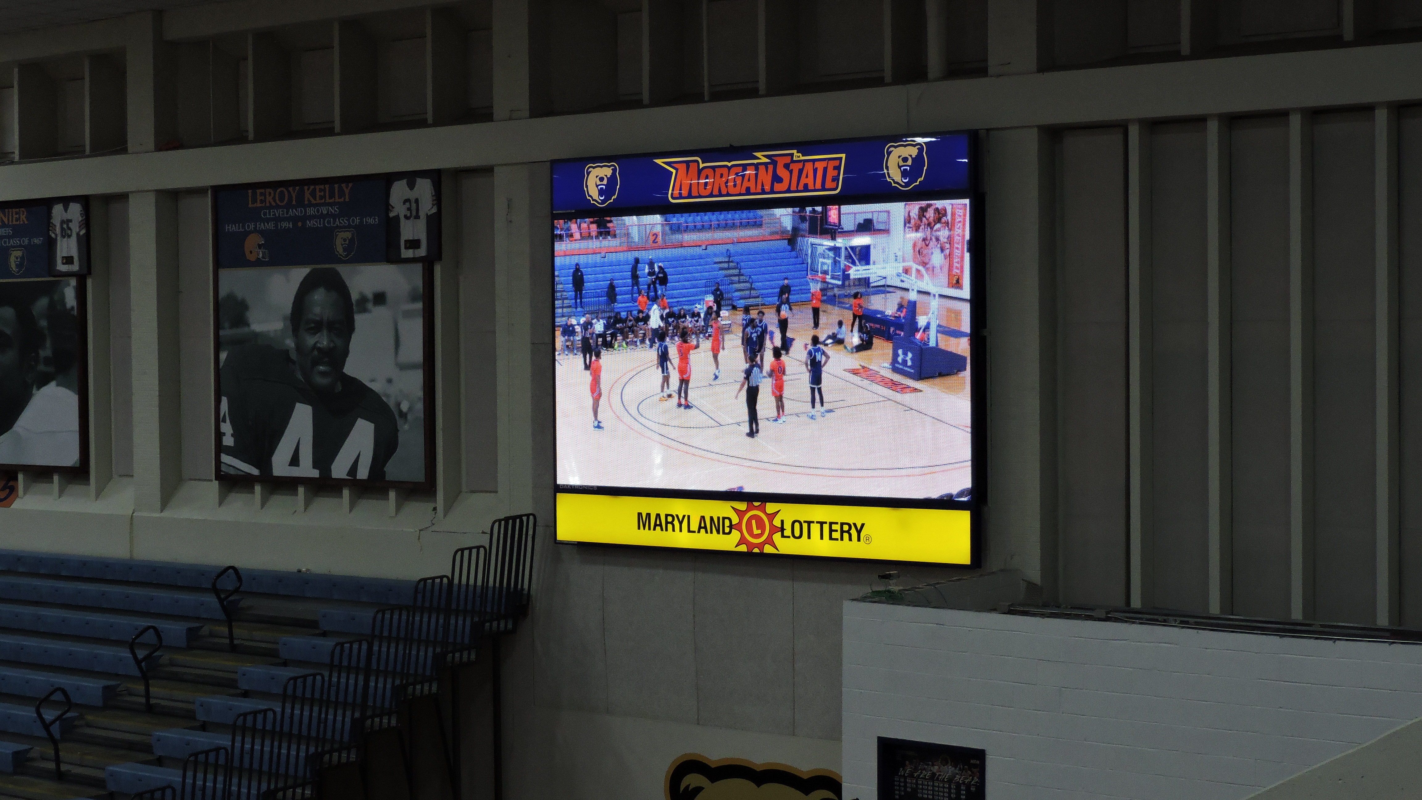 Hill Field House is a fitting place for all sports to be honored and Morgan State begins it with a Hall of Fame in the main entrance area. At the top of a side wall are each class of inductees, along with their picture. Display cases then follow in the side hallway and they contain a nice variety of trophies, some of them quite intricate. Team pictures and even a giant bear statue add more character to the area. Inside the gym, there are no achievement banners, but rather huge pictures of former Morgan State athletes that have had their number retired.