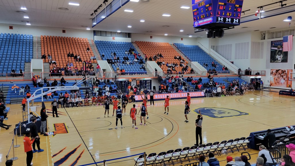 Being a Sunday in November against a no-name opponent, I wasn’t expecting much of a crowd and that was indeed the case with maybe 100 folks there at the start of the game. However, this was a doubleheader as the Women were playing at 2 PM against Sacred Heart and as the Men’s game was wrapping up, the crowd was at least 4 times the original size. Conference play is better for crowd numbers and Morgan State ranks in the middle of the MEAC in terms of attendance. A weekend game in the heart of the season will generally fill about half the gym.