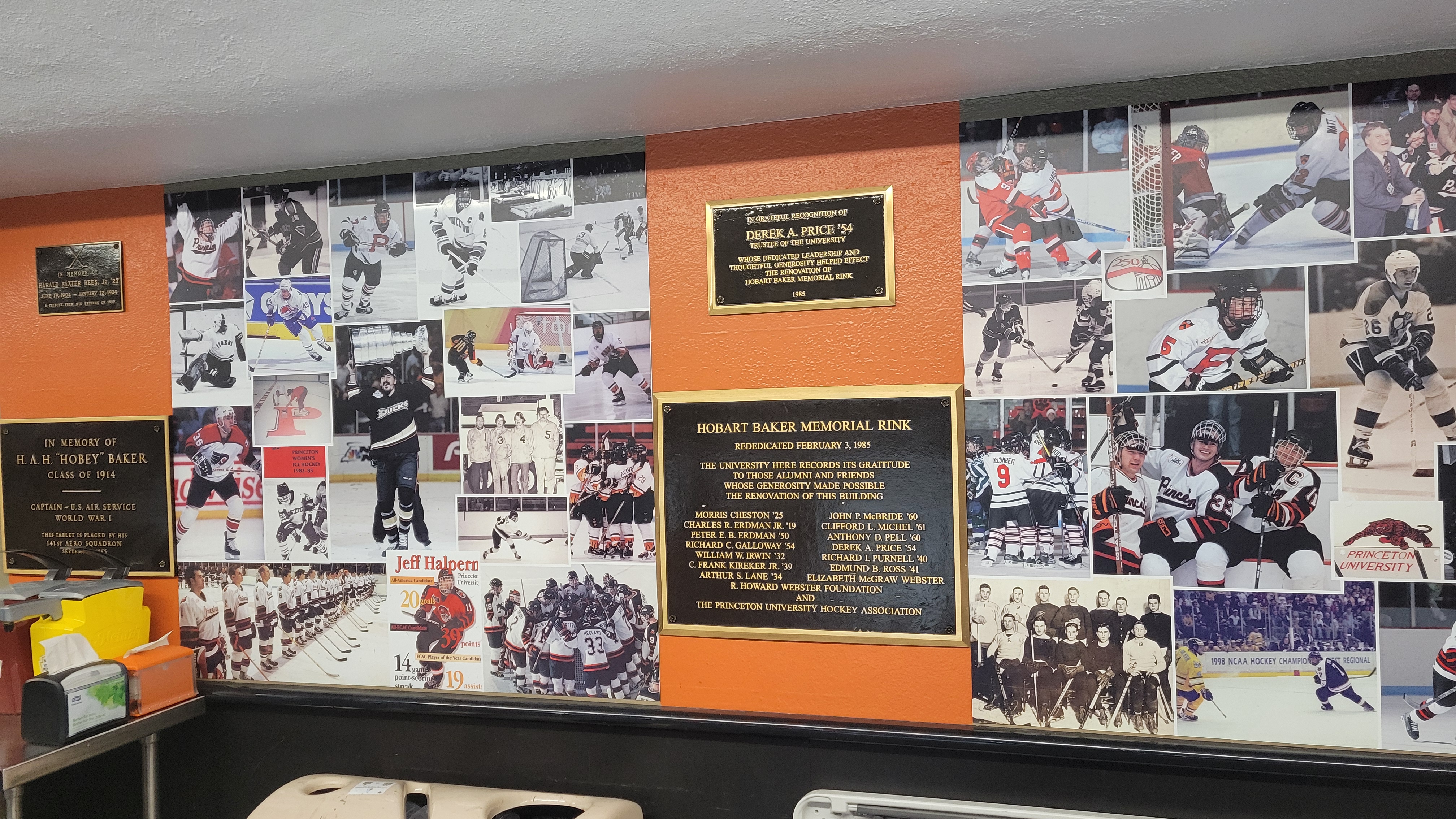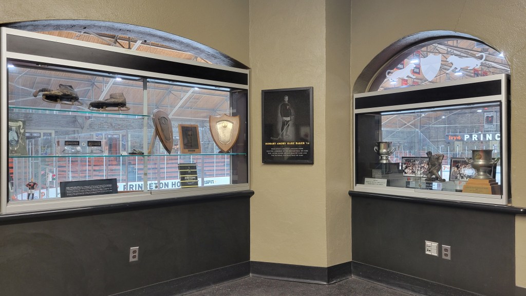 Princeton honors its hockey past well and it starts with the namesake on the rink. Hobey Baker is one of the most recognizable names in the sport because of the year-end trophy. That is in a display case here, along with other great mementos and information on this standout that was lost way too soon. In an opposite corner is a touching tribute to another great player who tragically passed away young. Princeton’s Patty Kazmaier was top notch in the sport and as a person and she is honored here too. Down the halls of the rink, you’ll find other various plaques, pictures and trophy cases. The rafters also have traditional banners as well.