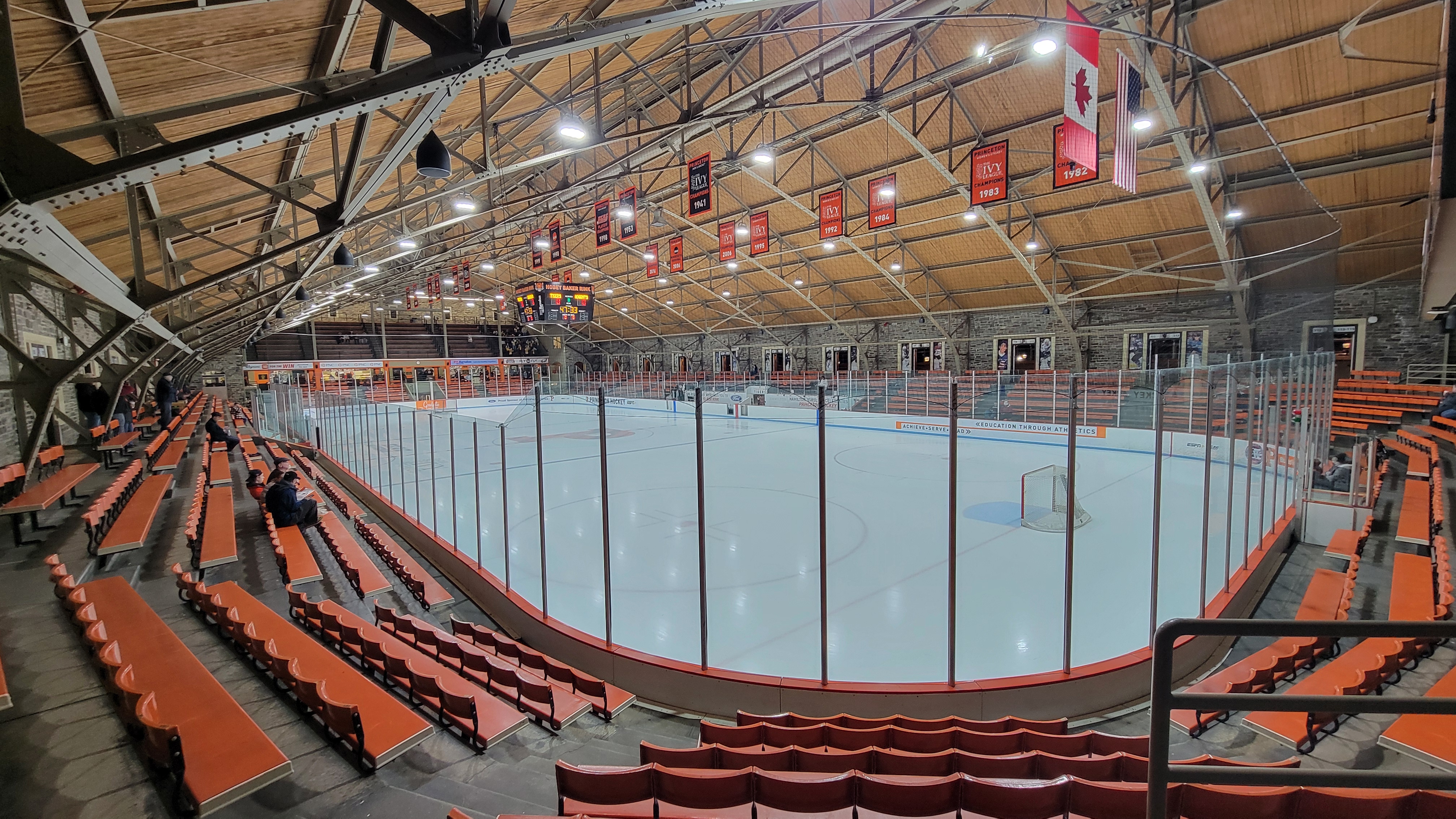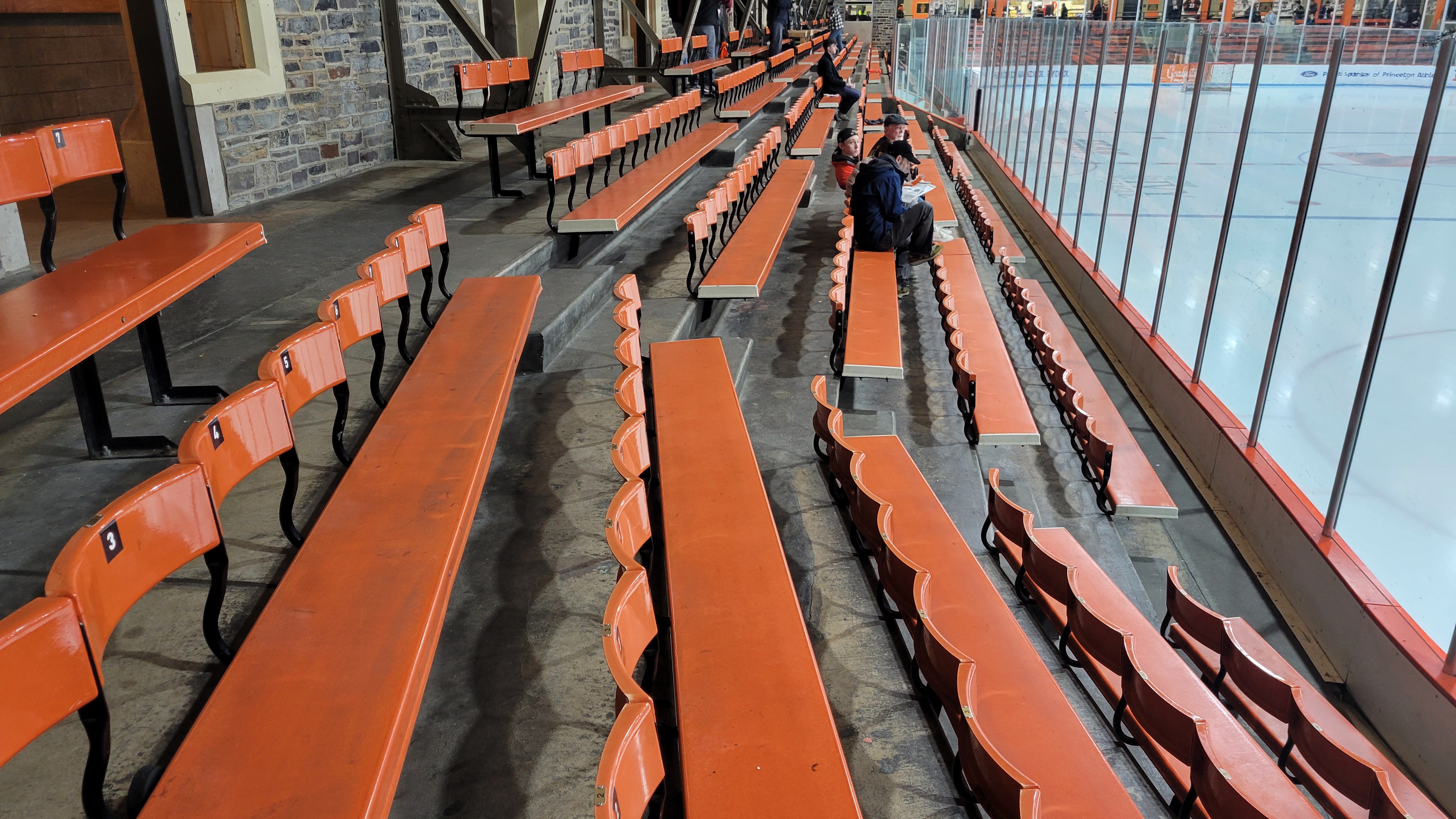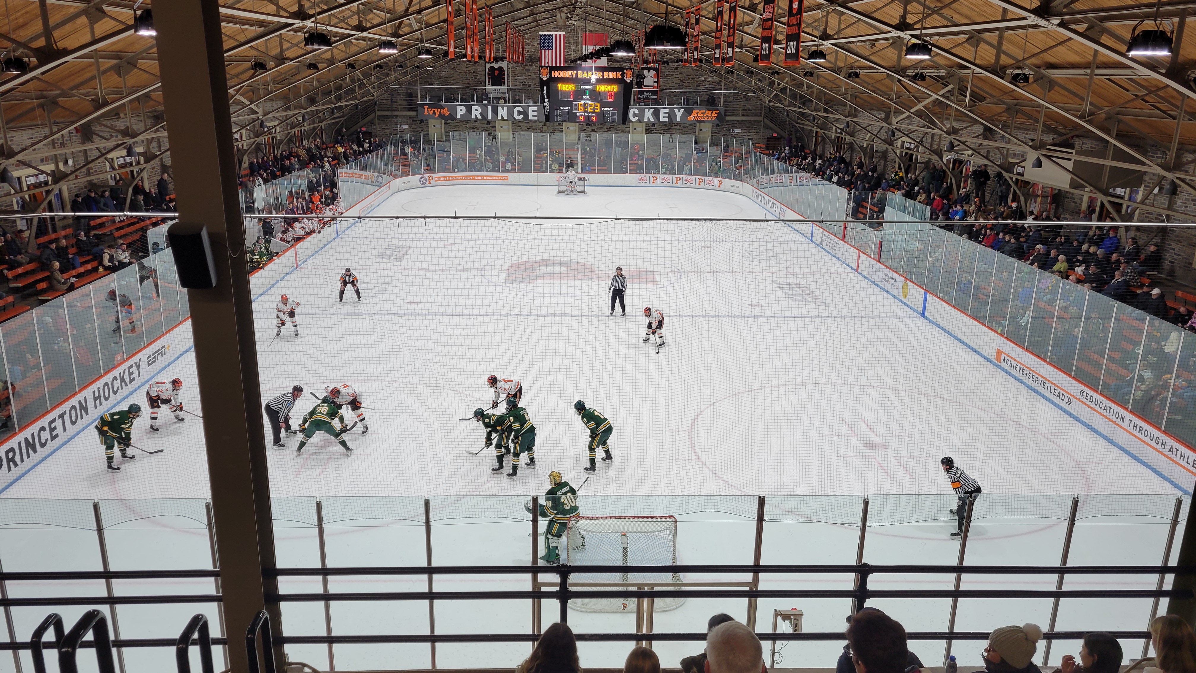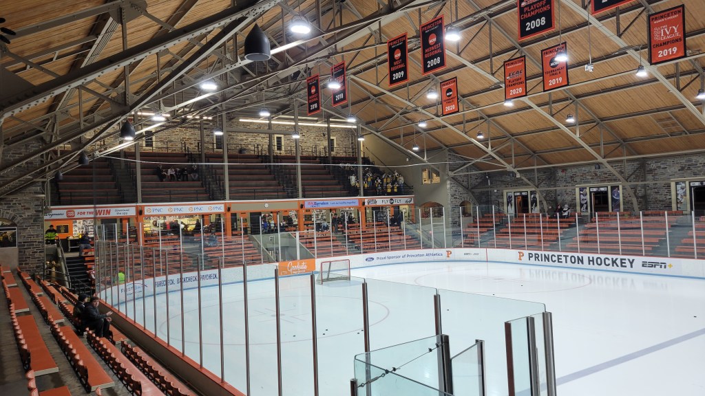 Historic Princeton University, founded in 1746, is located in the borough of Princeton, NJ and after attending several sporting events at the school, this was my first time seeing hockey. This small, upscale community in Central Jersey is a wonderful place to live and visit as the residential area gives way to a great central road (Nassau Street) with mostly local businesses. On the other side of Nassau is the University, which takes up about half the town. Princeton gives off an aura of prestige and many great minds have studied at the school that has produced over 30 Nobel Prize winners. While many other sports have seen plenty of achievements at Princeton, hockey really isn’t one of them. Up to last season, their all-time winning percentage stood at just .422 and the Tigers have had only one winning season out of the last 12. They did produce one of greatest hockey players of his era, Hobey Baker, whom the rink is built in honor of after he tragically passed away overseas. It’s the second oldest in Division I, having opened in 1923 and while the structure itself is quite unique, it is a very uncomfortable place to watch a hockey game.