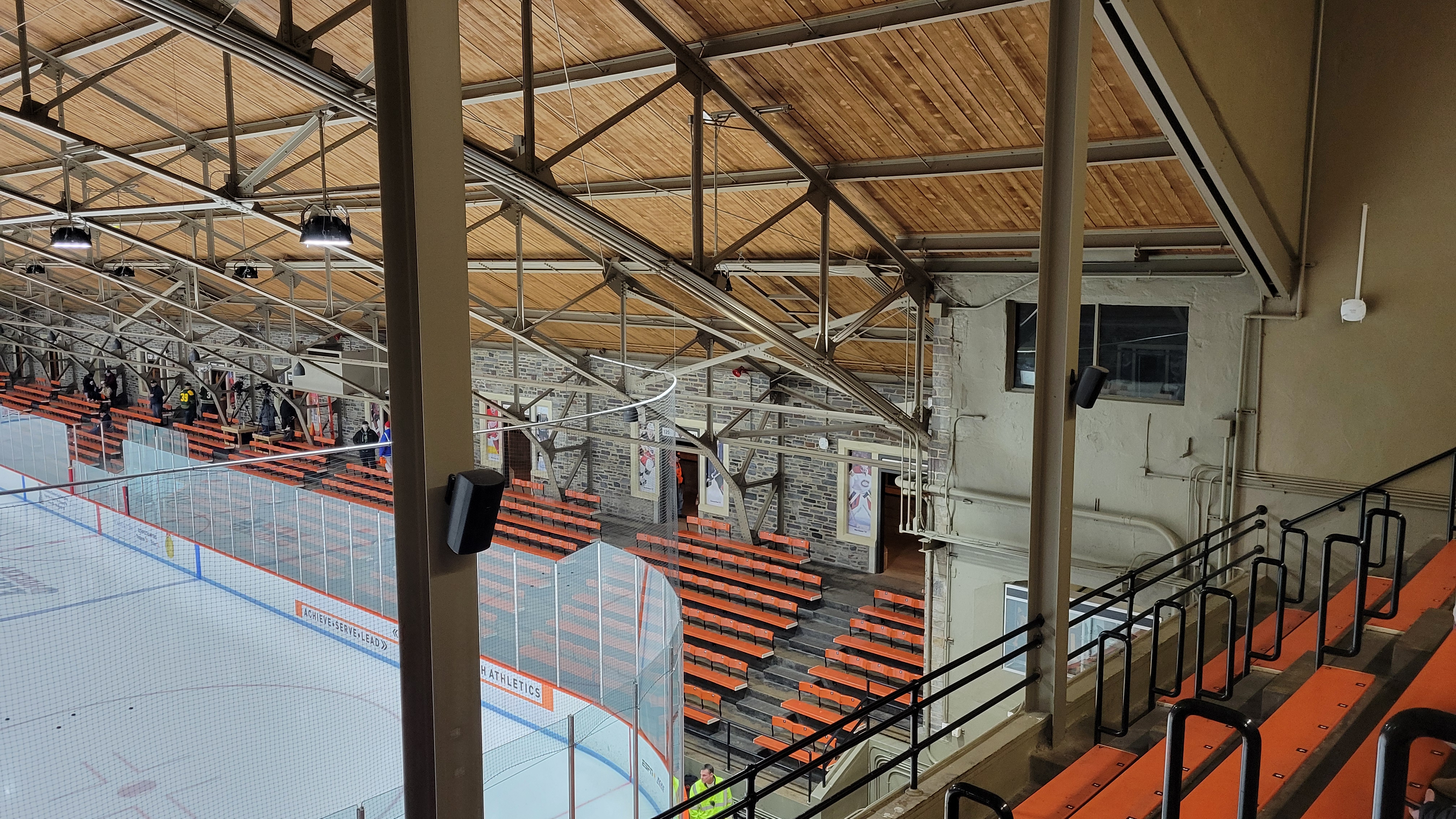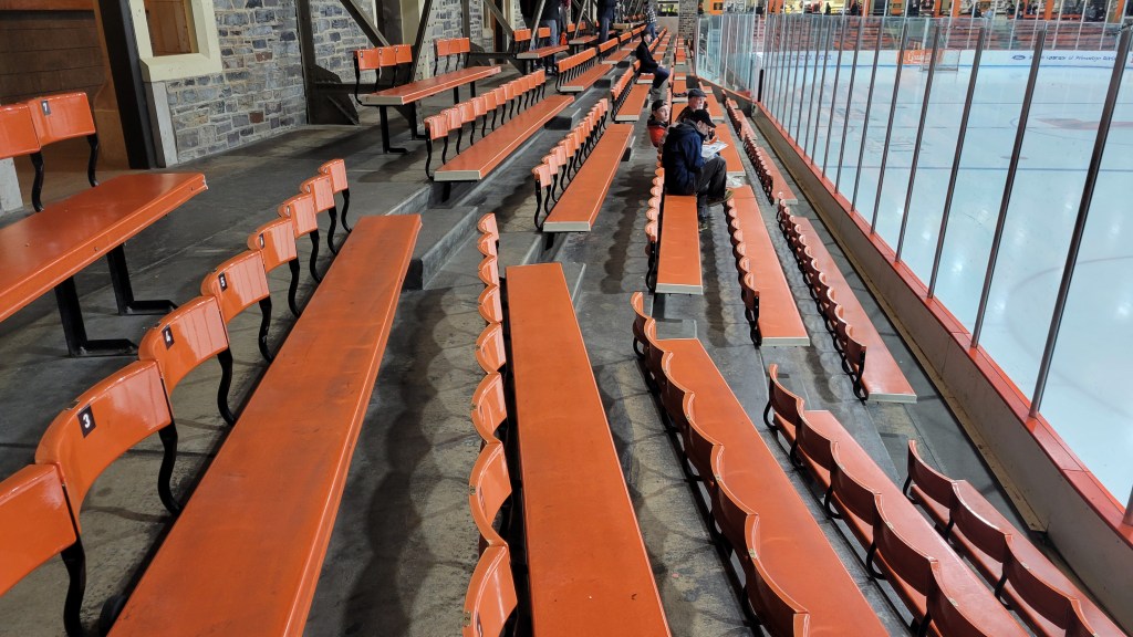 Hobey Baker Rink may have the impressive architecture, but overall it is a terribly uncomfortable place to watch a game. First off, the confines are so small that it means it is freezing. Like I need my hat and jacket kinda cold. Most of the seating only consists of 5-6 rows around rink. They go from glass to back wall and that means you can’t really see that well at the other end of the rink. Several opt to stand in the back. Seats themselves are cold bleachers, but the orange color is a nice touch and molded backs aren’t bad either. Row spacing is tight. It’s crazy that it’s so small in here, the press row is on an elevated walkway above the end of the rink. At the other end is an interesting feature and a good one if you want a better perspective as there is a raised and very steep upper deck. The stone walls and arcing wooden roof keep the historic vibe going inside.