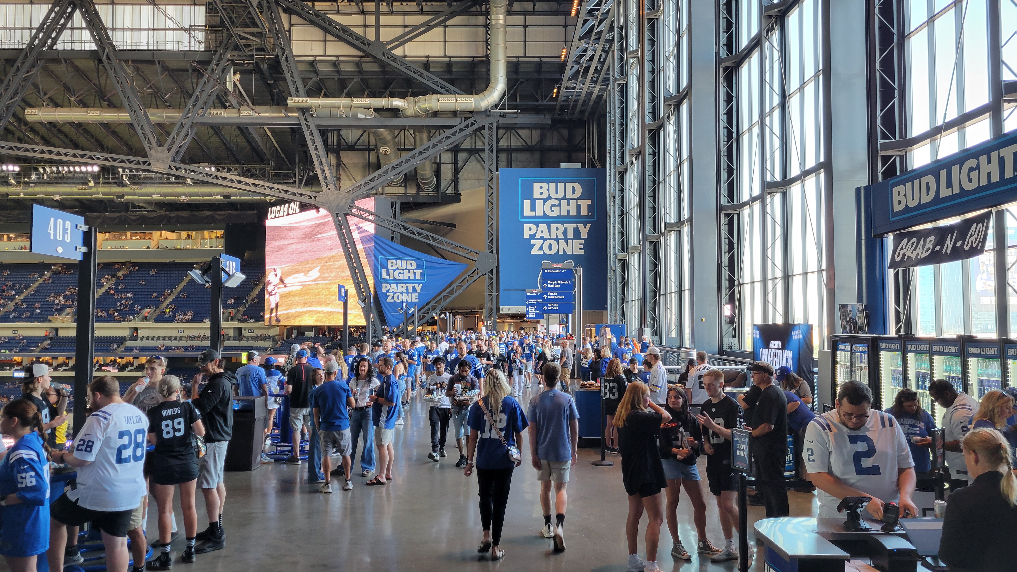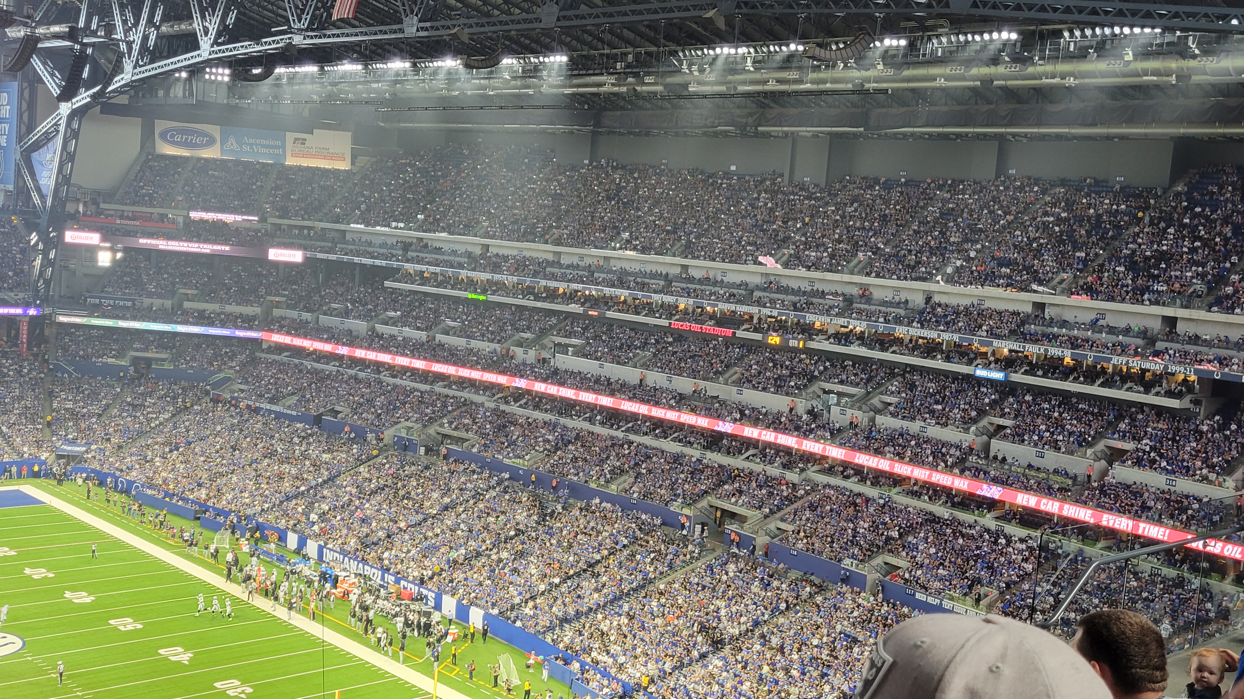 Touchdown Town gets the gameday experience going as this fanfest area in front of the stadium includes knick-knacks and corporate giveaways. The area wasn’t as great as other NFL cities, especially because a lot of the tents required sign-ups to participate. There is at least a stage with a band playing. Inside, as we get closer to kickoff, cheerleader and mascot appearances are followed by a motorbike entrance as the team follows. There is then a guest “Anvil Striker” before we are off and running with football. Indoor stadiums help enhance noise and that is the case at Lucas Oil Stadium as the crowd got loud on plenty of occasions. It didn’t come close to the deafening volume of Ford Field, but Indy did a great job on the noise front, matching some of the louder outdoor stadiums that I’ve been to. Having watched a lot of NFL, my ranking on how they come across on TV for noise/atmosphere, I’d probably put Indy somewhere #10 – #12. For our game, the crowd brought it when they should and big plays / touchdowns featured impressive roars. Not everyone liked to stand though as it was a sporadic mix. It was the first time in an NFL stadium that I was asked to sit down. When the Colts score a touchdown, expect a few fireworks and confetti streamers, which is fun. In 2023, they started playing DOOP (“Maria”) after each score and that gets the fans pumping their arms. My issue with it is the Philadelphia Union (MLS) have been using this for wayyyy longer and the Colts should find something original.