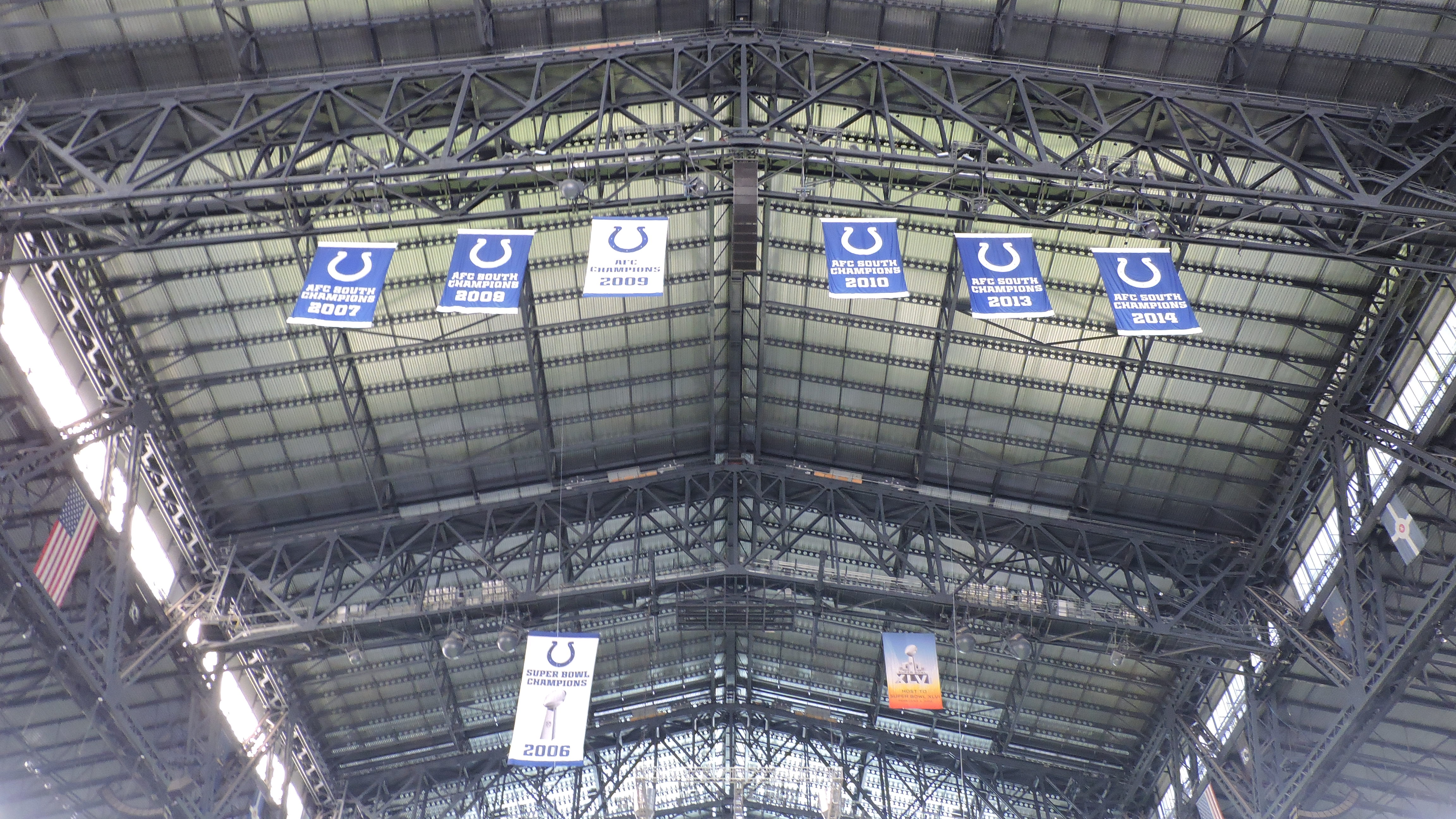 Peyton Manning will always be a hero in this city and the franchise’s most important player is honored with a statue outside the north entrance of the stadium. I was disappointed to see it barricaded and even protected by security before the game! Couldn’t get an up-close look. Inside, the coolest Colts feature I saw was the anvil that is part of a new pre-game tradition as they push the horseshoe narrative. There’s also a memorable ticket stub collection that is pretty neat. Nothing though on Colts history or moments/players. Lucas Oil does do a good job of making this a state venue as there are helmets for high school teams, honors for current state football champions and an Indiana Football Hall of Fame. One of the great things about playing indoors is that you can hang banners from the roof. They do that quite appropriately here with the right ones standing out. Finally, while Peyton is the only one with his number retired, 17 other past Colts have their name on the Ring of Honor around the stadium.
