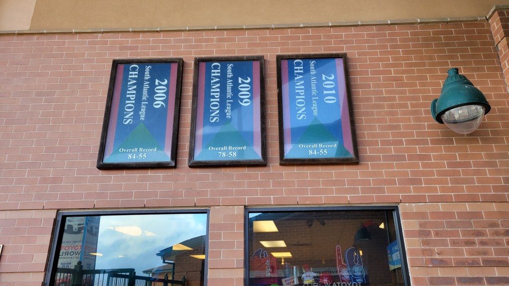 On a concourse wall are displays for the team’s three league championships. These are placed vertically in a manner that you have to tilt your head to read it. It’s pretty limited in the team display department as the only other thing were 2 numbers on the press box level as the BlueClaws retired #19 (Cole Hamels) and #29 (Ryan Howard).