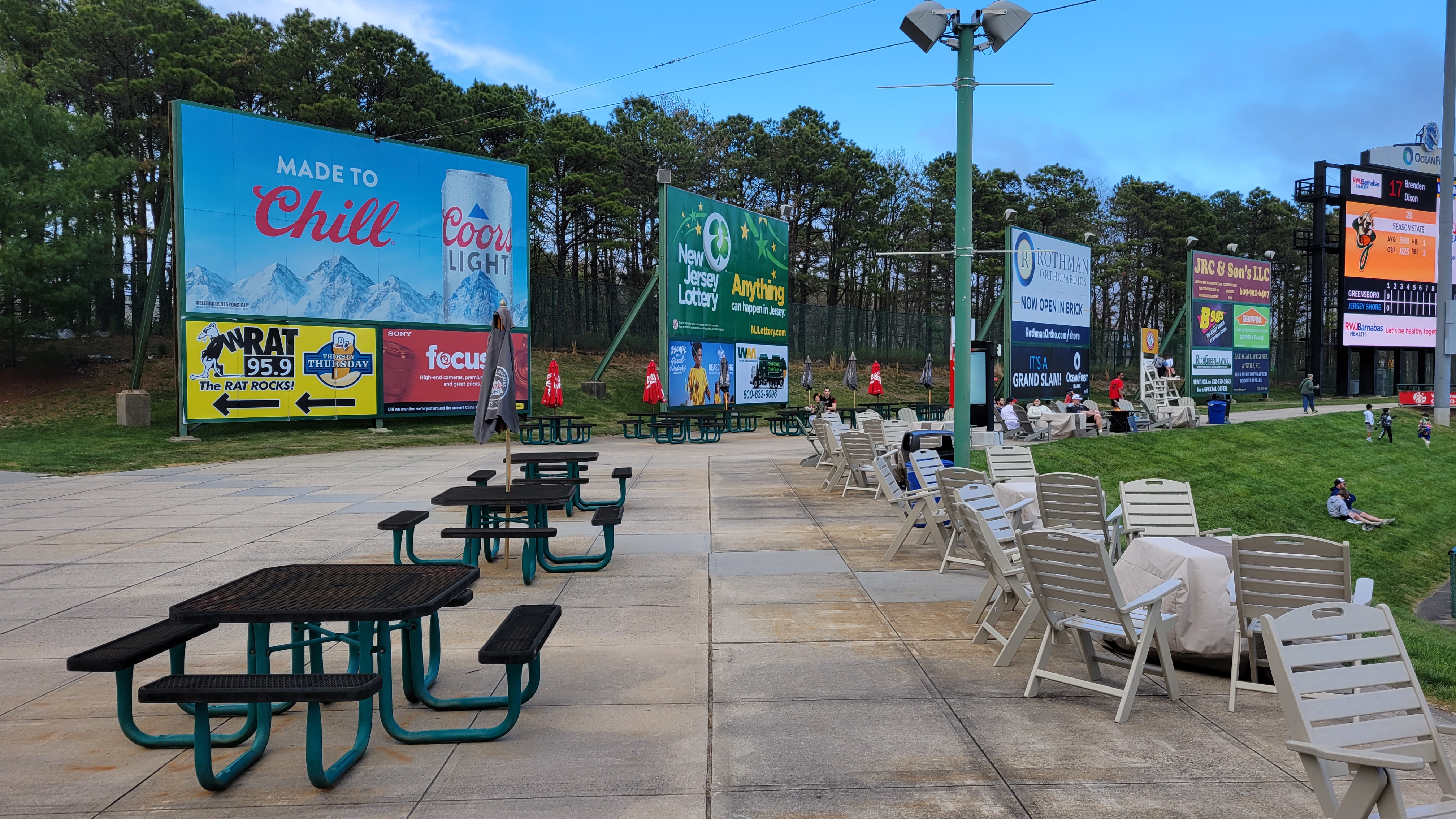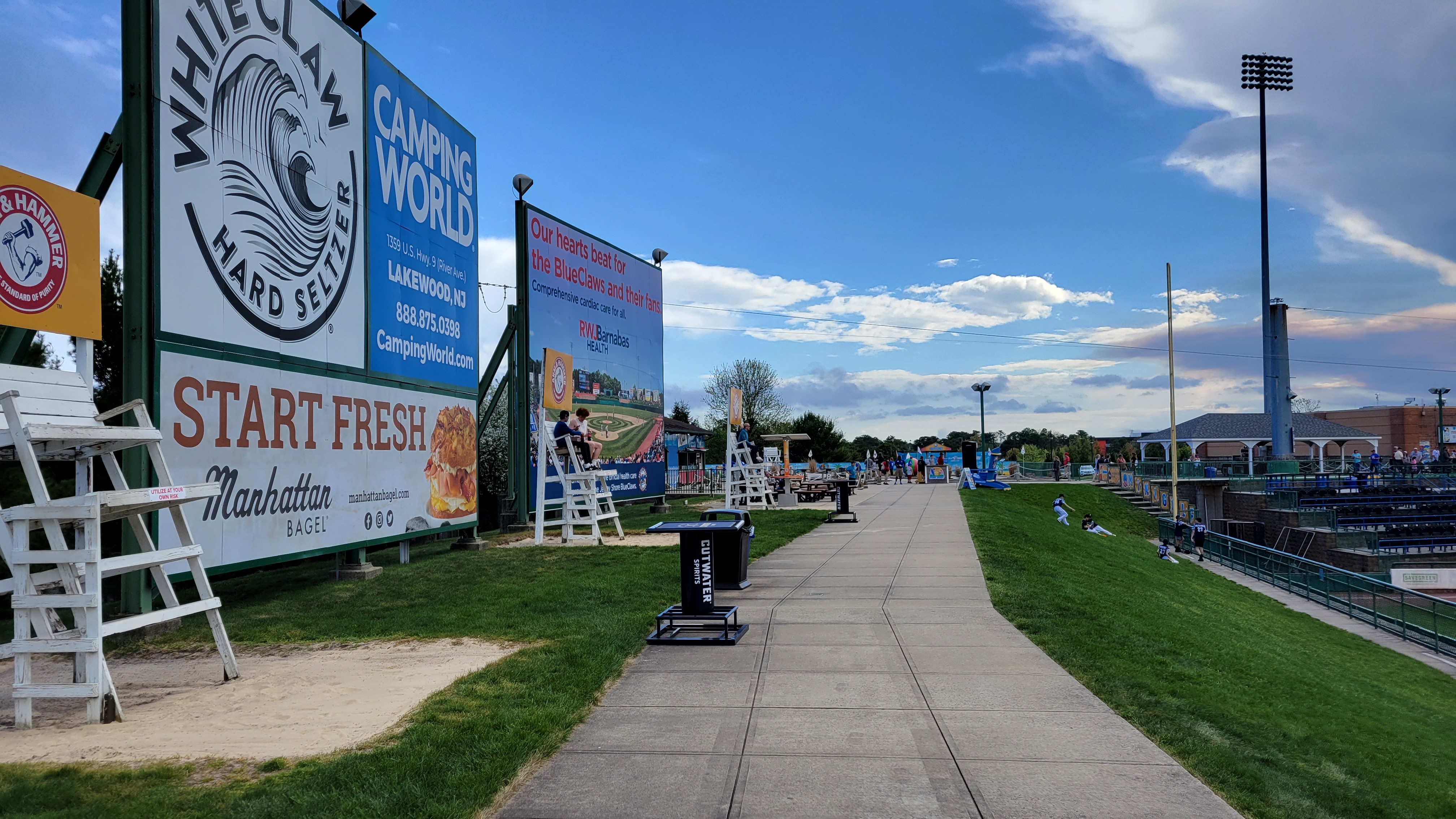 Wrapping 360 degrees around the stadium is a concourse that works very well. Closer to the infield, the covered section features field views the entire way and is outlined by brick on the inside wall and green berms, poles and ceilings. Standing tables scattered toward the field side allow some to stand and watch. As the walkway heads to the outfield, it turns into “The Boardwalk”. It’s a popular area (especially with the kids) and there’s so much non-baseball going on. You’ll find miniature golf ($4 for 9 holes), carnival games and inflatable rides. I do like the huge lifeguard chairs as that is a cool touch and a nice perspective of the game, though it’s mainly kids playing on here. You’ll also find grassy seating, multiple picnic areas and a separate section that acts like a giant outdoor bar (with a stage). Above the open seating in left field are lounge chairs that circle a small fire pit, making for a comfortable hang out to watch the game. Lakewood was ahead of its time for “social spaces” at sporting events and they have a solid theme to work off of as well.