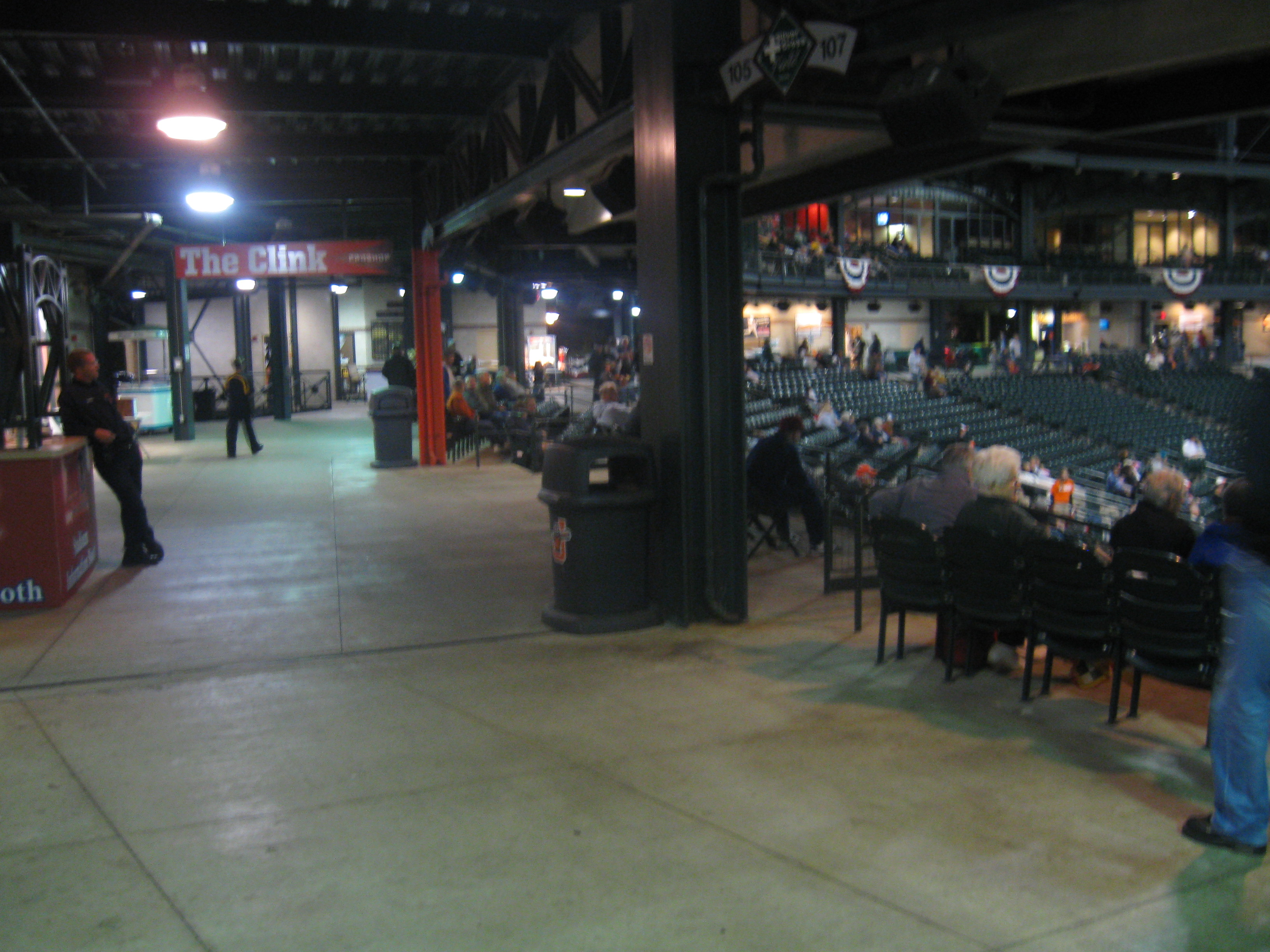 Fans climb stairs to get up to the concourse and it is a fairly standard one, covered by the suites and exposed to the playing field. It is clean and wide enough with dark green beams and light brick walls. Near home plate is “The Clink”, an odd, but appropriate name for the team store. Though the concourse doesn’t really extend beyond the foul poles, it was nice that a walkway allowed you to go all the way around the outfield.