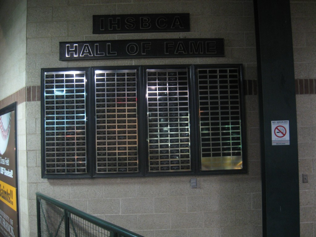 Outside, but connected to the stadium in the front is the Joliet Sports Hall of Fame. Frustratingly, it was closed when we arrived at the ballpark. That’s the second time that’s happened to me… what’s the point of these hall of fame’s when visitors can’t see them at the peak times people are visiting? Otherwise, no team banners here yet as this is the Slammers’ first season. Given the financial disaster that was the Jackhammers (the former tenant at Silver Cross Field) all memories of that team in the stadium seem to have been erased. One other note is a concourse wall contains the names of the Illinois High School Baseball Coaches Association Hall of Fame.