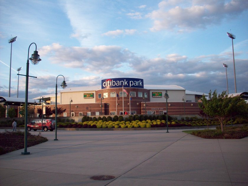 Surrounding the stadium is some beautiful landscaping as the large congregation area in front is decorated with various shrubs and flowers, along with fancy street lights. It sets a nice welcome and the ballpark itself also has an appealing look. For the most part, brick is used and there are two main entrances in the location of first base and third base. The central focal point includes a large “Citibank Park” sign at the top and an American flag in front. The ballpark also has more of an elongated appearance as the rounding is gradual and the front face almost appears to be flat.