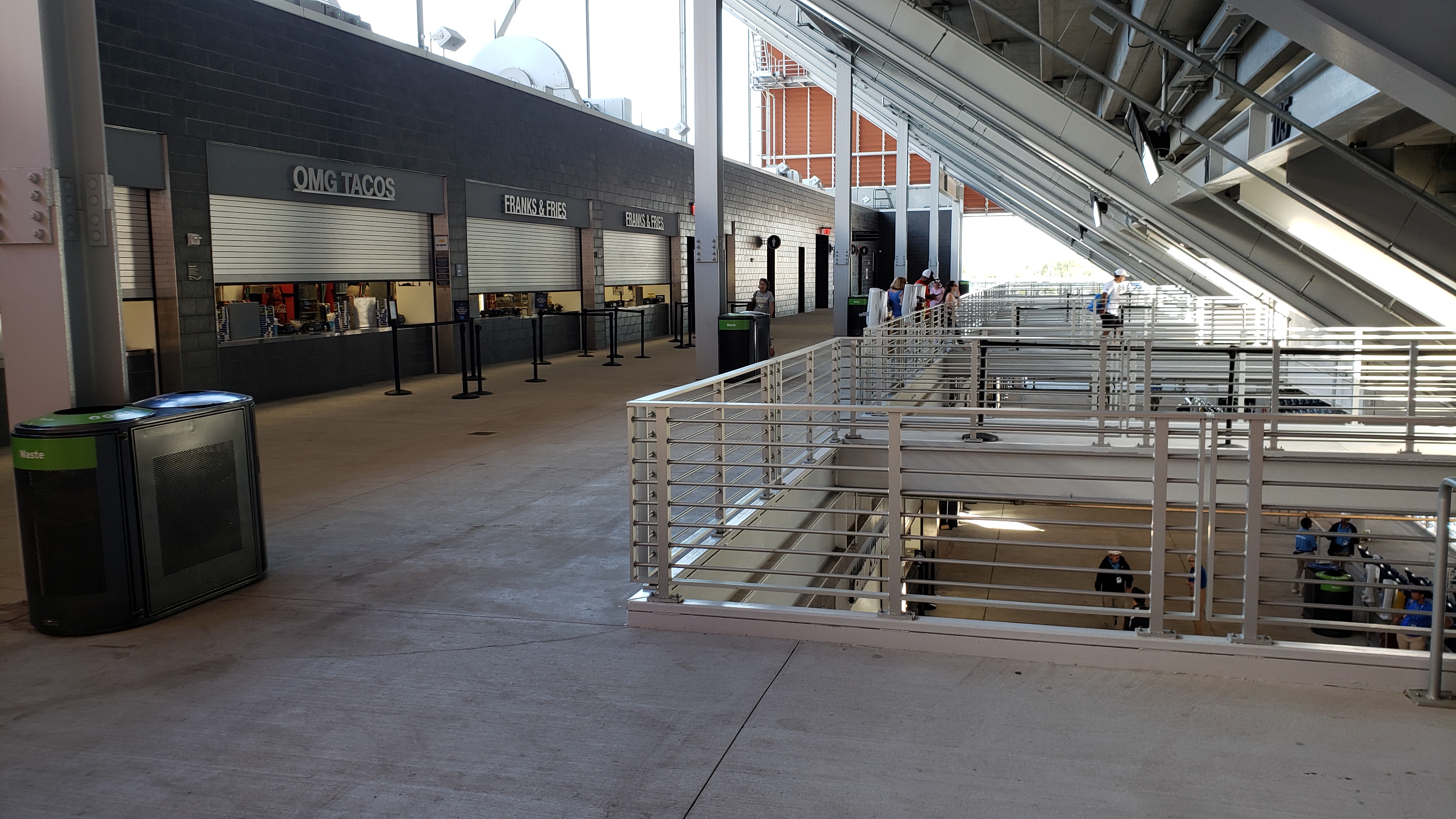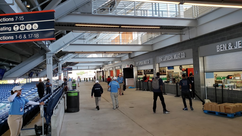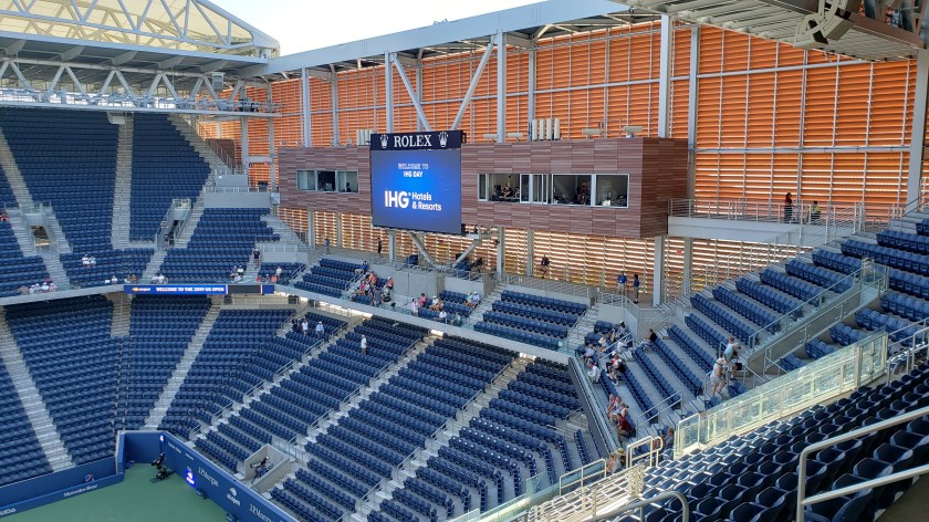 Sightlines from the top deck seem like they should be great as there are three steps between rows, proving how steep the stadium is with attempts to feel closer to the action. However, there were many instances when the head of a fan in front of me got in the way of the court view. This happens in Ashe too, so I think it’s inevitable in large tennis stadiums due to court dimensions, because I don’t know how it could be steeper (and you don’t want to be farther away). Also, the sheer size of the upper deck can feel daunting when on a seat search as it is a hike to the top. More end seats would have balanced that out, but I wouldn’t want to sacrifice that cool design with the Terra Cotta panels. They should’ve allowed more standing and viewing space behind the end seating instead of just making it a passageway. Because the top is GA, fans wait at the concourse opening to enter during changeovers. Sometimes though, that seat search and sit process takes too long and the line doesn’t completely finish, so you annoyingly have to wait another two games. It also means that there is a lot of shuffling during breaks in the match. In addition, you have to avoid seats near the glass partition by the concourse opening as those lead to obstructions. Large ceiling fans and designer tricks help lead to some air flow in the stadium. There are no suites or clubs in the bowl.
