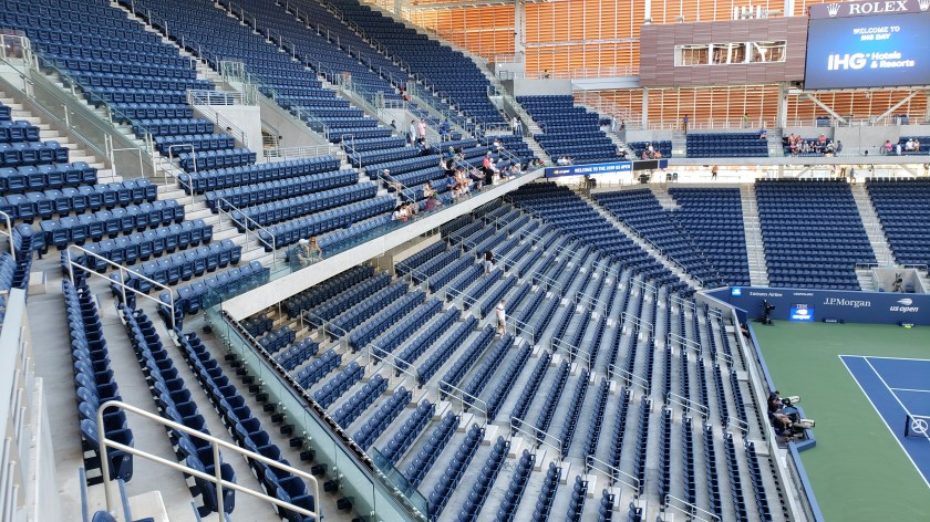 The inside of Louis Armstrong Stadium is aesthetically breathtaking when taking in long-range views. There are two decks of seating and about 40% of the seats come in the ticketed lower level, which is shaped in the traditional block “O” format. The upper deck are the general admission sections and the shape is unique with each corner row getting higher and higher until finally reaching the top of the stadium, where they meet with five middle sections. Ends are significantly smaller in the second deck as they go down to just three or four rows. Each seat has its own fold-up chair, which is wide and comfortable as drink holders rest on the seat below. The chairs are dark blue and that contributes to the wonderful look at Armstrong as the deep blue is both consistent with tournament colors and pleasing to the eye. Then you have those aforementioned copper-colored blinds that cover the openings at the end. They enclose and protect the stadium, which the white roof does from above too. Now, matches can be played in two stadiums during rain, a huge plus for fans and players. The roof structure also provides tons of shade as much of the stadium avoids baking in the sun for long periods.