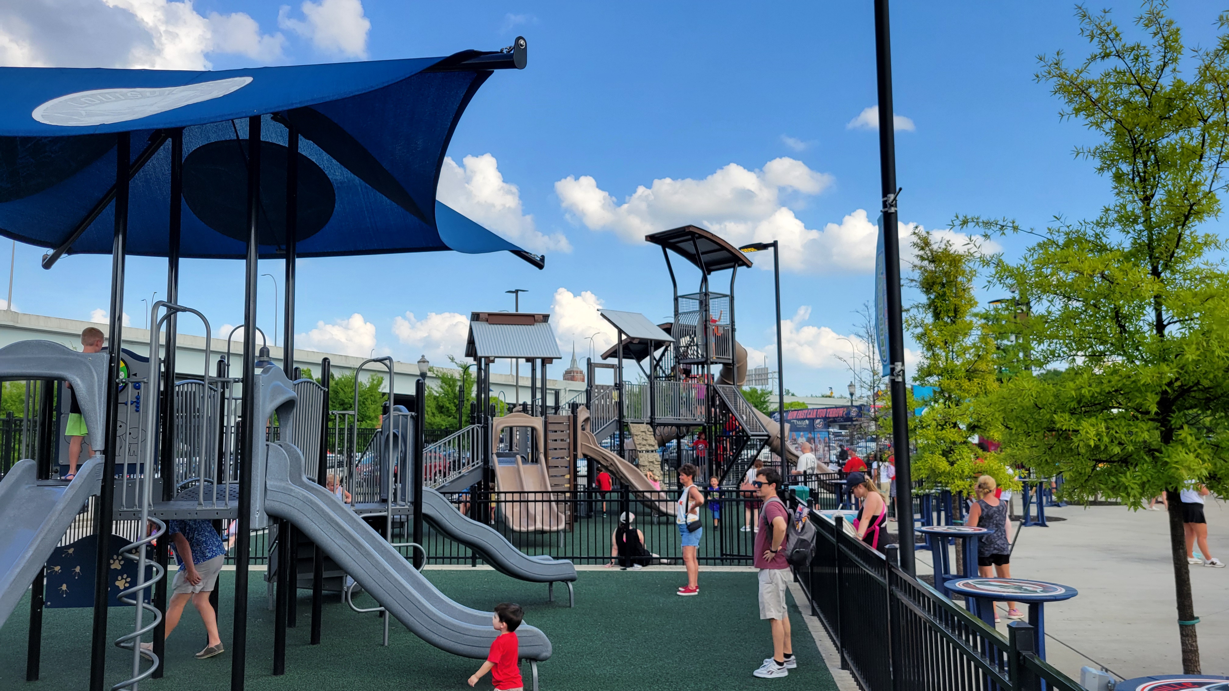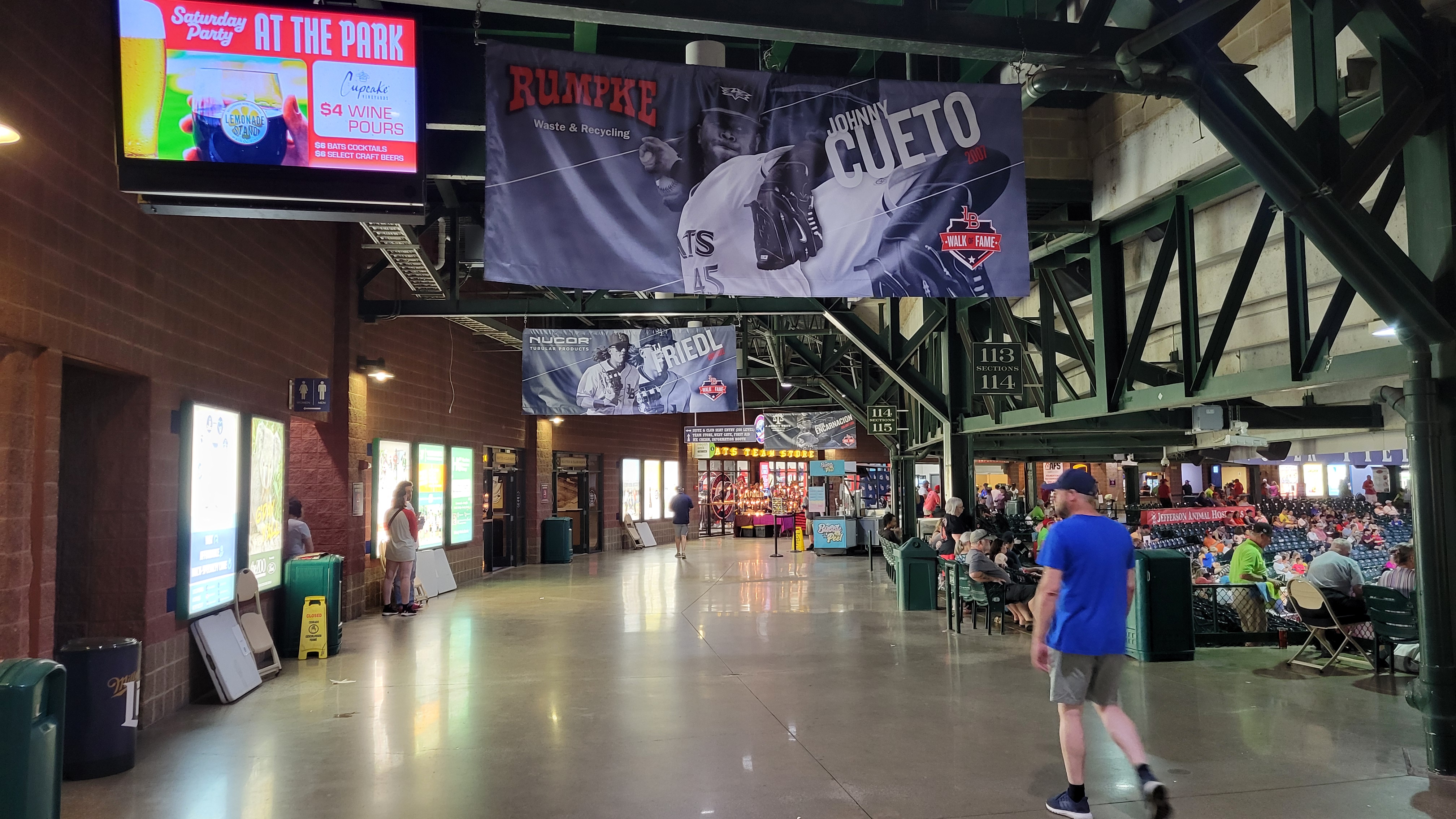That massive entryway into the former train warehouse doesn’t have a ballpark feel, but it is mighty impressive. The towering wood-paneled roof and the brick outlines is such a cool arrival as you head towards the ballpark entry. There’s an East Gate, a central area for suites/clubs and then a much larger West Gate, which acts as an event space. It also is a good spot for autograph sessions. Once past ticket scanners, you’ll walk into a much more typical concourse. Open to the field and covered above, there is a clean look with brick walls, green beams and seemingly spotless floors. This ballpark does not feel 25 years old. The concourse has an enclosed vibe because when looking towards the field, the upper deck dips down and protrudes outward by a lot. Space is generally ok, though roped off lines and portable carts can jam things up. Space quickly opens in the outfield corners with lots of area to roam and a variety of bars and other seating areas. The playground also in the vicinity is really impressive and would even be adequate as a standalone in a park.