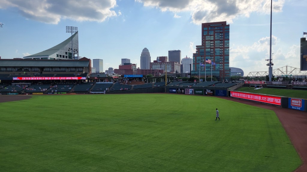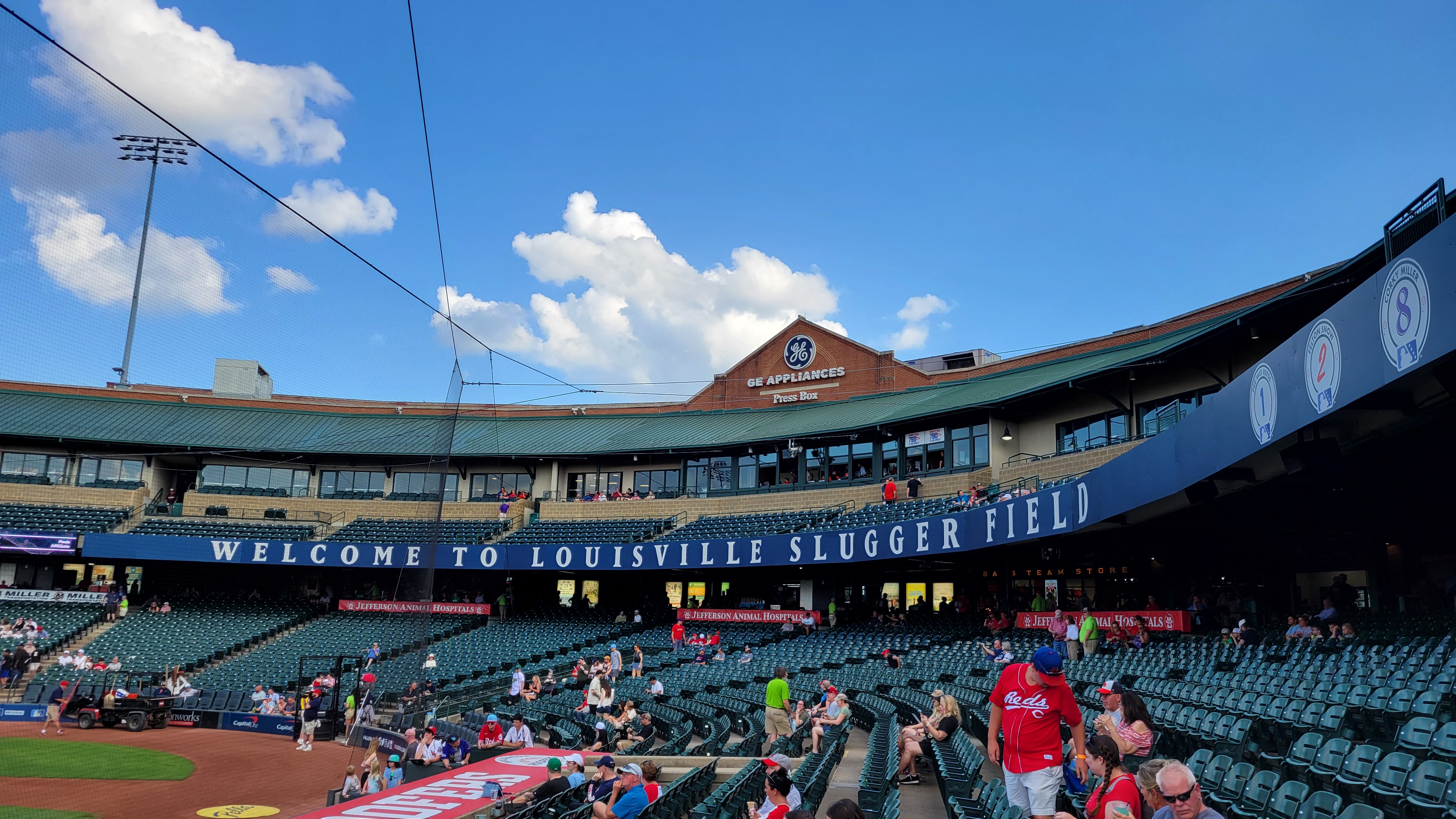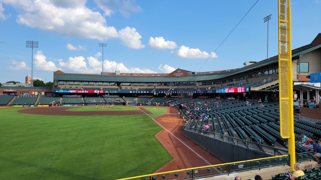 Our vacation to explore the Bluegrass State began here in Louisville and this is a fun place built on Bourbon and fixtures in American Sport. The ‘Ville is the home of Muhammad Ali, the Kentucky Derby, the Louisville Slugger and a Power Four Basketball team with a deep history. The Commonwealth’s largest city (population of 633,000) sits on the Ohio River that divides Indiana and Kentucky. Midwestern and Southern culture combine here and for the uninitiated, it’s called “Lou-ee-ville” or “Lou-a-ville”. I first learned of one of those pronunciations watching NFL Primetime as a kid when I would mimic Tom Jackson yelling “From….Louisville!” during a highlight. Over to a different sport, baseball. The Louisville Bats were born in 1982, however minor league baseball was a part of the city before that and for much of the 20th century. The Bats is a great duel nickname as it is an ode to the famous manufacturer down the road, plus you can do plenty with the mammal for merch and what-not. Louisville wasn’t always the Bats as the franchise started as the Redbirds when affiliated initially with St. Louis. They became the RiverBats in 2001 and then Bats a year later. Around this time, nearby Cincinnati started as their MLB partner. As members of Triple-A, Louisville has won four league titles, their last coming in 2001. Since then, it’s been a terrible run on the field: Just one winning record since 2012 and it has been 15 years since a playoff appearance. Games are played at Slugger Field, a ballpark that opened in 2000 and scores well in almost every category.