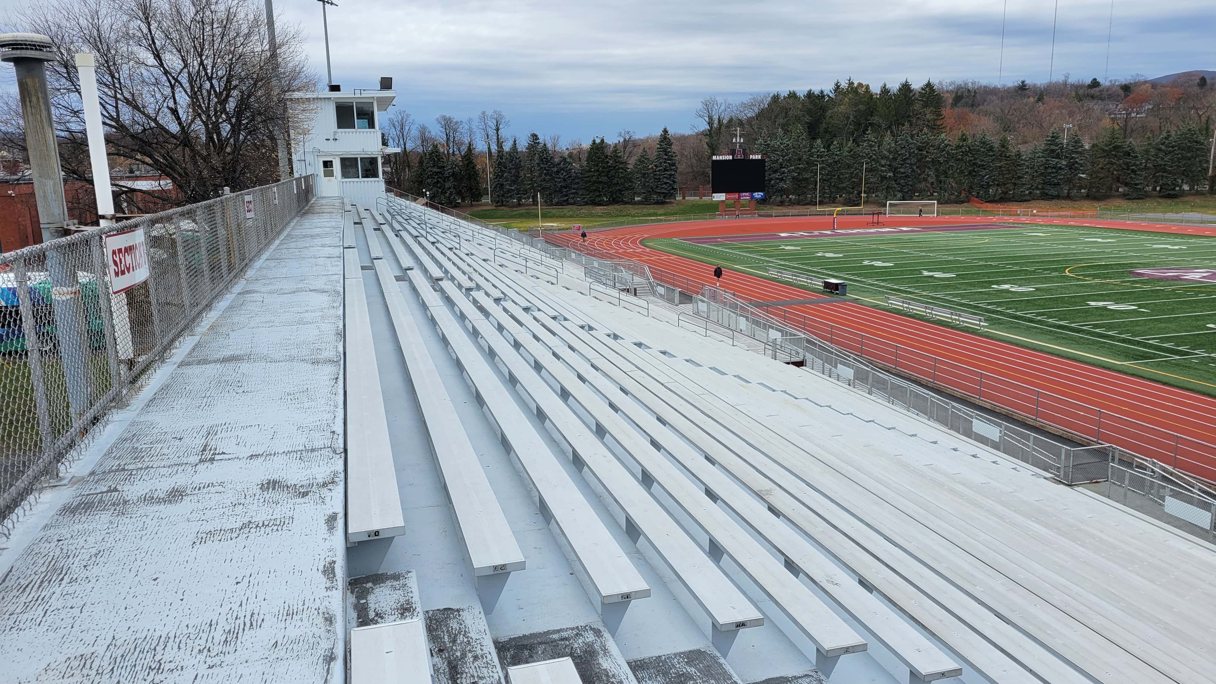 As you would expect, the seating structure is simplistic as Mansion Park just features a straight pair of sideline bleachers. This allows for it to seat over 10,000 people as the large “home” stands have 30 rows, extending the length from end zone to end zone. The cold bleachers are set on a concrete base and the spacing between each row isn’t quite enough where you can lean and create your own back. Height is good for the sightlines, but both a track and a walkway push the stands away from the football field. Daytime views from this side include spruce trees to the left, a neighborhood with the Baker Mansion to the right and eye-appealing hills in the distance. Over on the other “visitor” side, the bleachers are at a lower row-by-row pitch and on a clanky metal base. Despite being smaller, they still are of decent size in comparison to other high school fields. Both sidelines are topped by a press box, which is pretty cool for those schools looking to broadcast their games. The main sideline features a double-decker press box with the stadium name written in the middle.