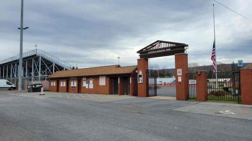 To make up for the lack of a stadium structure, there is an entrance area in the southwest corner. The brick columns and iron gates are topped by a decorative sign saying “Altoona Mansion Park”. It’s a welcoming little entrance that is located right next to a ticket office building.