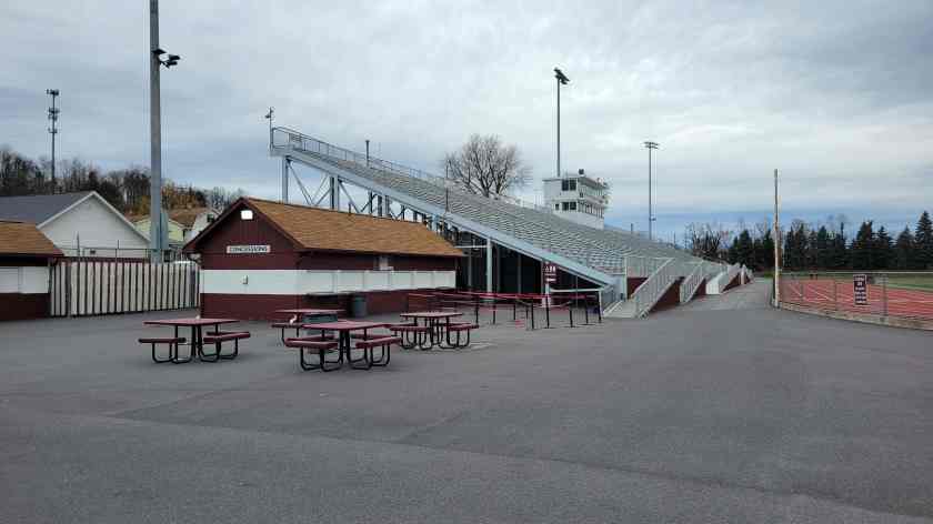 There is a ton of open space around the sideline seating stands and the confines of the grounds includes an additional grass football field, ideal for kids throwing the ball around during the game. Most will congregate in the corner by the main entrance and there’s a few picnic tables in this area by the concession stand. The walkway behind the bleachers is closed off during the game and the small bathrooms are at the beginning of the entrance.