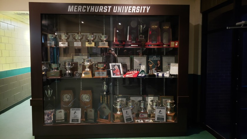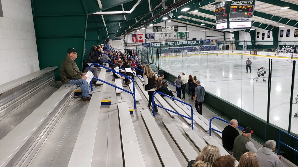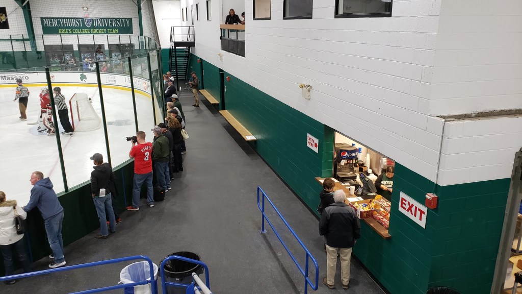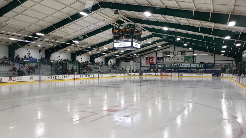 Built in 1991, the Mercyhurst Ice Center was built to bring games to campus as the Lakers were previously playing in the downtown civic center (Tullio Arena)….This is the 3rd smallest arena in D1 hockey…..The Men’s bathroom contains four urinals and two stalls. So that’s a total of six places to go for 1,500 people. Yikes.
