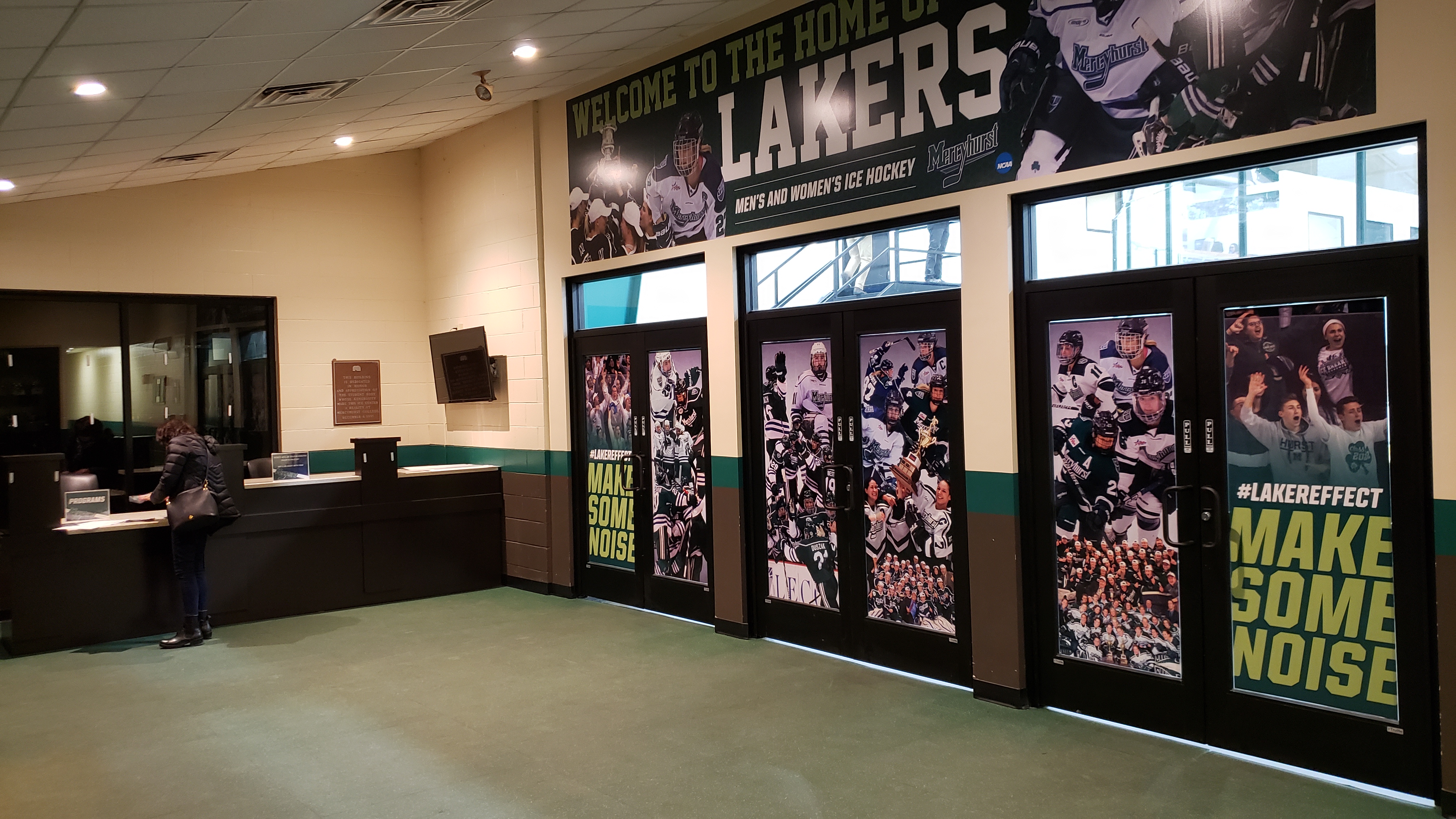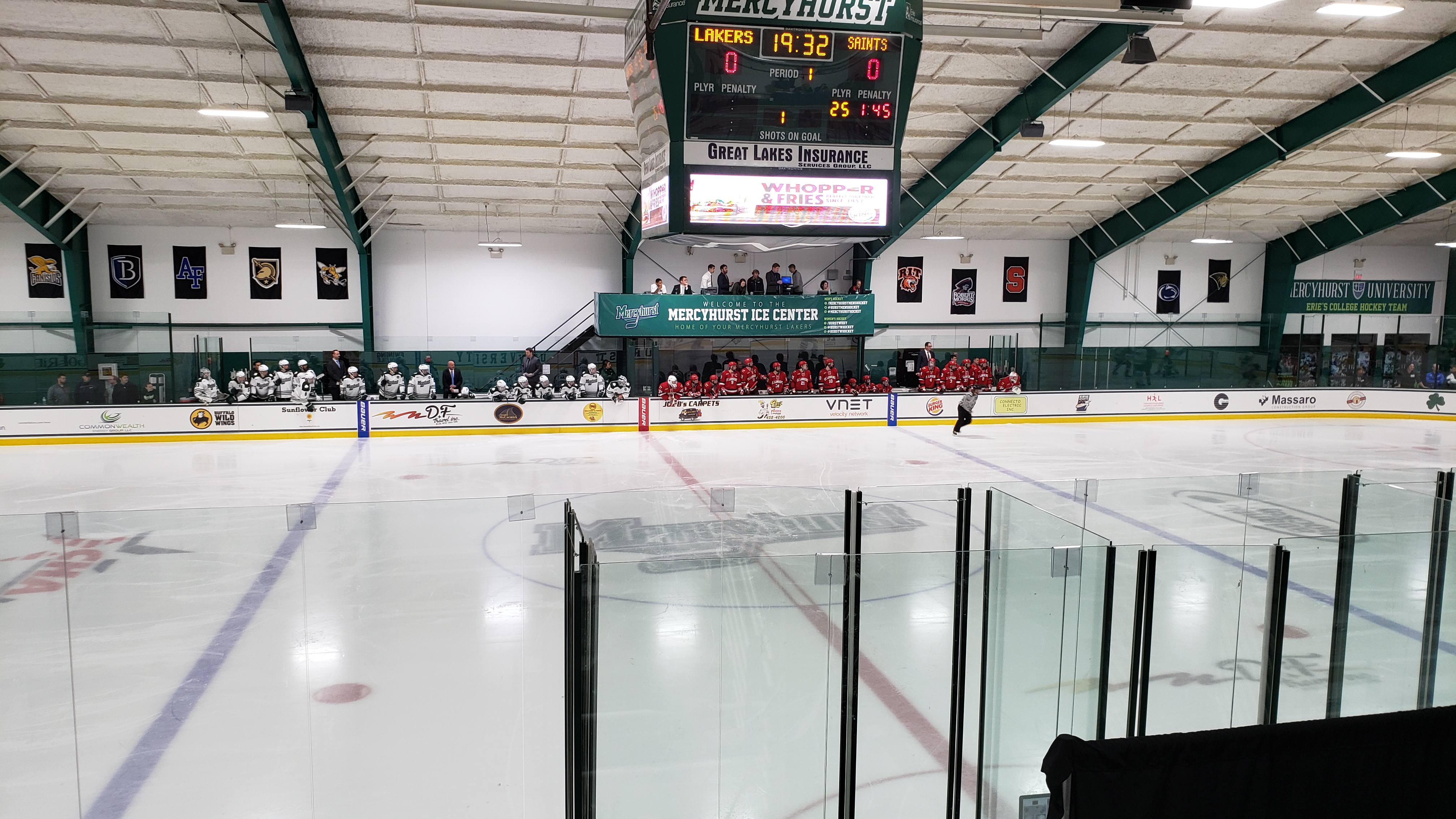 Built in 1991, the Mercyhurst Ice Center was built to bring games to campus as the Lakers were previously playing in the downtown civic center (Tullio Arena)….This is the 3rd smallest arena in D1 hockey…..The Men’s bathroom contains four urinals and two stalls. So that’s a total of six places to go for 1,500 people. Yikes.