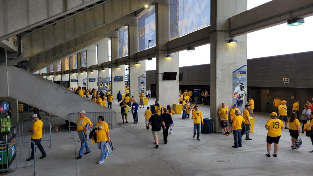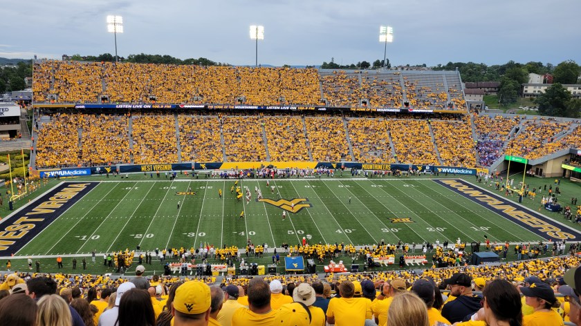 The atmosphere was great as it starts with the Pride of West Virginia marching band as they kick things off with a fabulous pregame show. The performance is entertaining and it is highlighted by their entrance in the WV logo and then the finale in the formation of the state outline. During that time, I caught wind of a little, “Take Me Home, Country Roads”, but no one was really singing it. The real show is when they play it post-game after a win as everyone sways and sings. Given the loss, I was saddened not to experience that and I think they would be much better suited making this an in-game tradition so that everyone is involved and it serves as a pump-up song. The famed Mountaineer mascot kicks things off by firing the rifle and it is usually accompanied by an echoing “Let’s Go”….”Mountaineers”. Offensive first down conversions and defensive third downs have hand signal little cheers that most participate in. Themed color days give the stadium a good look as some games feature everyone in Gold or the occasion “Stripe-Out” (blue and gold). Noise is decent, but it is not deafening. Initial touchdowns were met with muted exuberance as the place wasn’t exactly going nuts (maybe because it was Kansas). I thought that a lot of the time, the crowd was reactive as opposed to proactive as they struggled to get anything spontaneous going. There were some boos as the team struggled and I couldn’t believe the lack of football sense when the crowd started (and kept) cheering loudly as WV lined up to go for a game-tying 2-point conversion. Obviously, you need to shut up in that situation. At least, the noise got to a point in OT where I had to shout to the person next to me.
