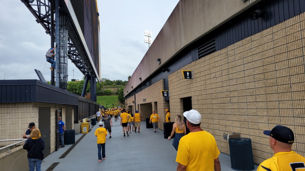 The Mountaineer mascot began appearing in the early 20th century and the tradition continues today with a student donning the buckskin uniform, coonskin hat and rifle. It is certainly a tremendous honor for each person…..The week before our game, West Virginia renewed their fierce rivalry with the University of Pittsburgh in a game known as the Backyard Brawl. The hatred was evident given the amount of “Eat Sh** Pitt” shirts that I saw…..Milan Puskar Stadium had a few great ideas as I liked seeing the free Stay Hydrated coolers, which encouraged drinking water. Also nearby were chairbacks for rent ($15) and after the game, you just leave them on the bleachers…..On the other side of things, this was a very old school stadium experience: paper tickets, game programs, vendors walking the aisles. I like it!……A chain link fence separates the students in the upper deck.