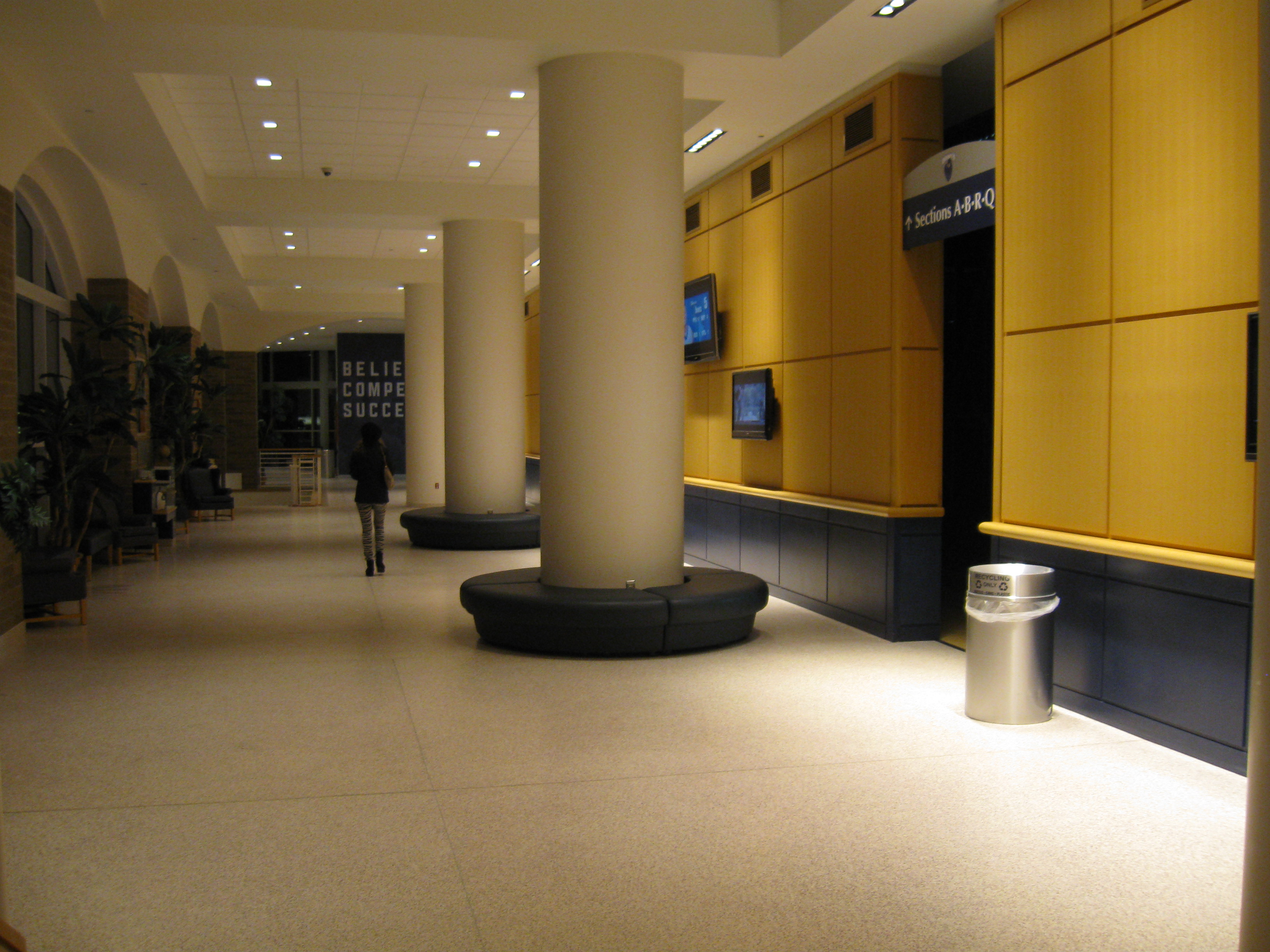 This newer facility does not stand alone as it is actually attached to the old gym on the southwest side. The lightly colored brick arena features a small main entrance wing that juts out of an otherwise square building. It’s not the smartest set-up as the box office is hidden outside and around the corner. I couldn’t figure out where to find Will Call in the dark of my second visit. The rest of the exterior is full of wide windows and topped off by a small, white roof. Generally, there’s nothing overly exciting about the design or look.