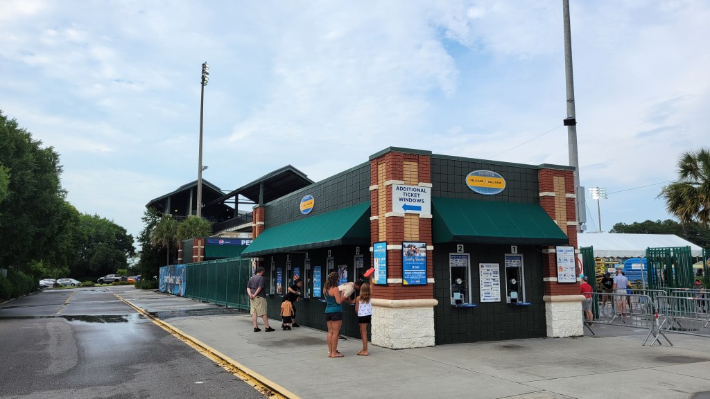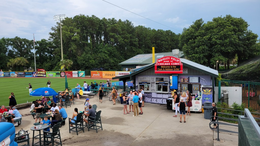 Myrtle Beach is one of the most popular beach resort areas in the country as millions flock here each year to enjoy sun, sand, golf and family time. I was one of those as five days were spent on vacation with the wife and kids. It’s a polarizing place as many love it, but others aren’t particularly fond of the busy-ness and the countless kitschy/stereotypical expensive touristy things. However there’s no denying that kids generally love it here and it is a super popular place for families. Myrtle is in the northeastern part of South Carolina, along the 60-mile Atlantic Ocean coastline known as the Grand Strand. The city may only be home to 35,000, but population swells during popular times of the year and the rest of the region is rapidly growing with people moving in year-round. Their lone professional team is the Pelicans, who started play in 1999 as members of the Carolina League (Single-A). They’ve won the league championship four times, with the last one coming in 2016. Their ballpark opened the same year that the team arrived and it temporarily sits without the usually lengthy corporate names that it’s had in the past. Expect plenty of Cubs related stuff (their affiliate), but there are local elements as well to the experience in what is a pretty decent ballpark.