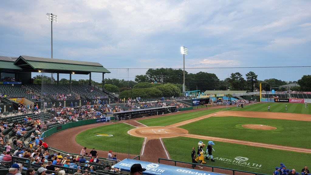 Seating consists of a lower 100 section that goes around the infield and then a walkway separates the shorter 200 level, which has 9 sections (compared to 12 below). What most stood out to me was how low the seats were to the ground. When I sat in our 200 section seat, it was startling enough to elicit a “whoa” as the fold down part was way lower than expected. The row height and spacing was just ok in this area. The bookend to the 200 level are bleacher seats (boo) that have a helpful overhang to block the sun. This seemed like an afterthought given that there are support beams in the middle of these sections. Behind all the green seats at the top is a suite and press level. Picnic areas can be found in the corners of the stadium on par with the 100s and it was good to see a Beach Bar that looked the part. There’s also a set of outfield bleachers as well. In terms of aesthetics outside the stadium, the primary one is the large water tower that looms over first base. Why can’t they paint this like they do with the Carolina Mudcats? That would really elevate the overall look. Outside of that, the outfield surroundings are mainly trees with peaks of the tall Myrtle Beach hotels in the distance.