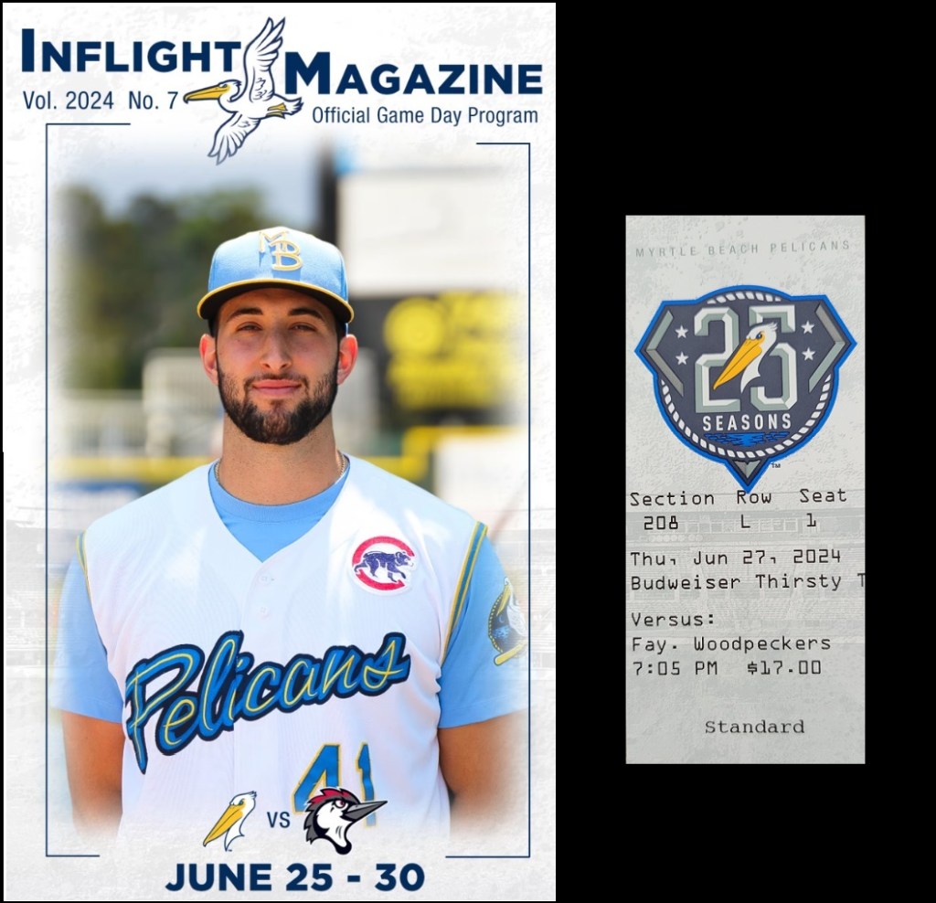 An earlier thunderstorm caused a 15-minute delay to what was otherwise a tidy affair. Myrtle Beach only gave up three hits as Jaxon Wiggins and Luis Rujano combined for a shutout. At the plate, Christopher Paciolla’s two-run double in the 6th inning broke a scoreless tie and the Pelicans went on to win 5-0.