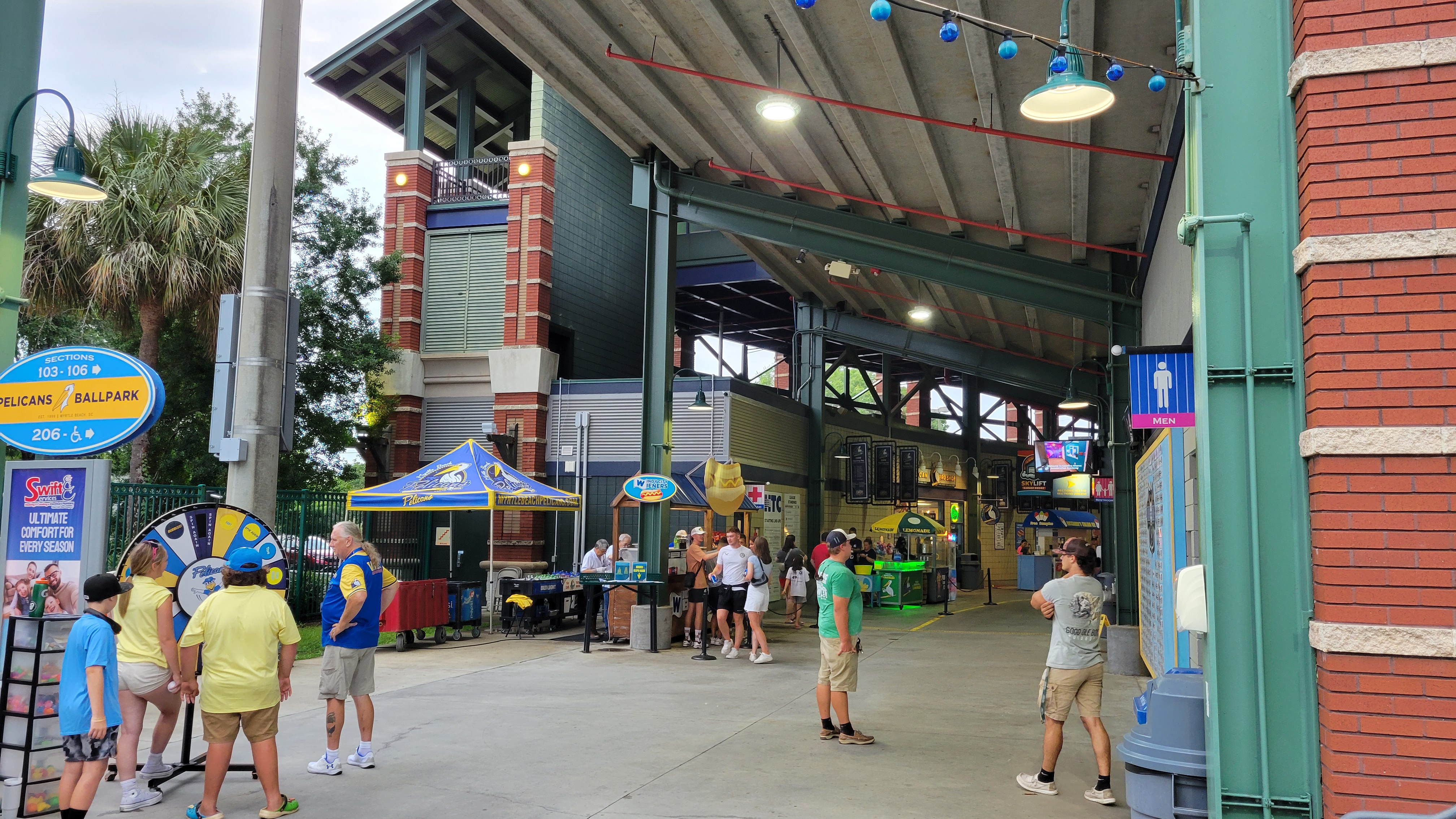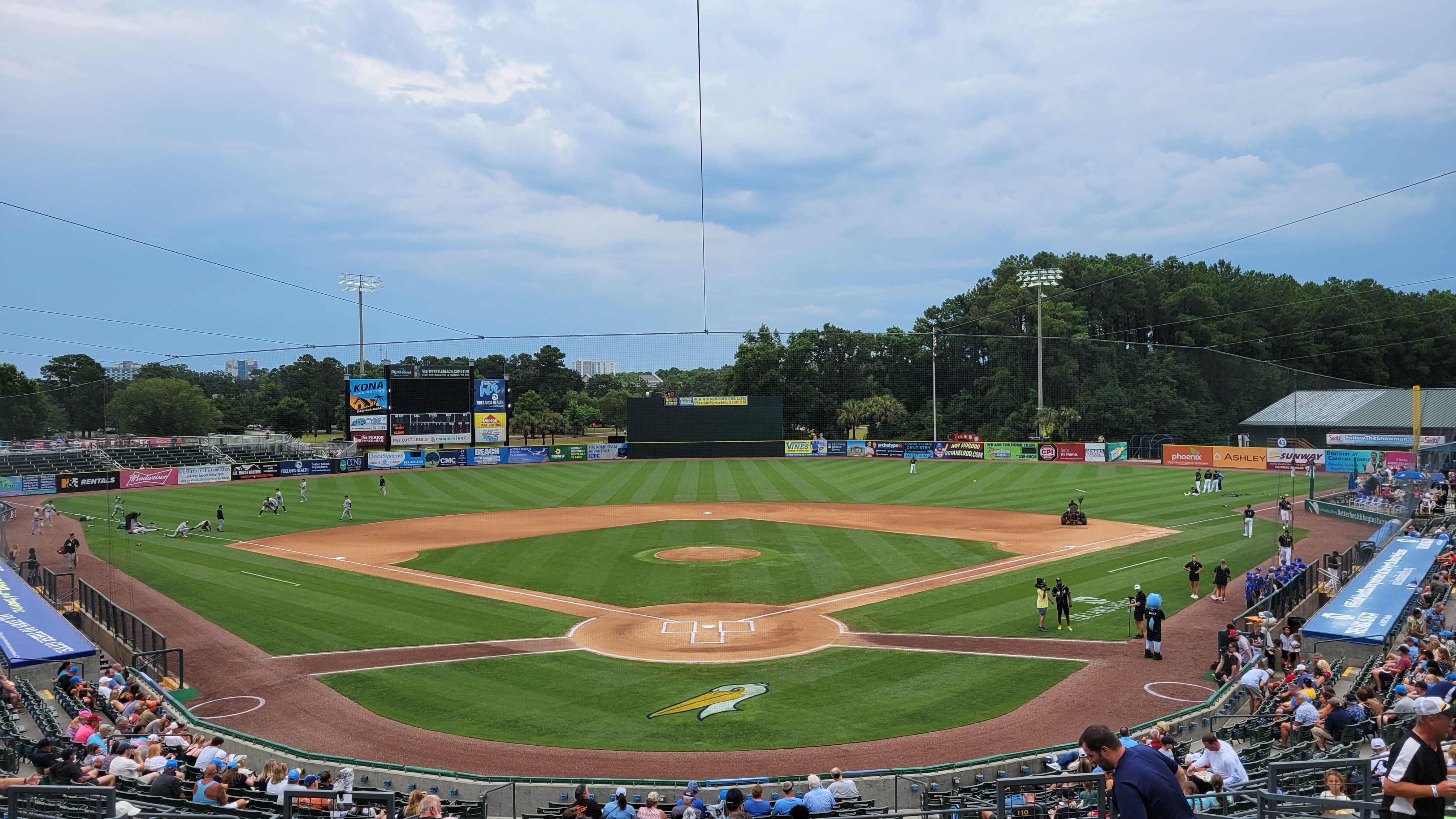 Myrtle Beach is one of the most popular beach resort areas in the country as millions flock here each year to enjoy sun, sand, golf and family time. I was one of those as five days were spent on vacation with the wife and kids. It’s a polarizing place as many love it, but others aren’t particularly fond of the busy-ness and the countless kitschy/stereotypical expensive touristy things. However there’s no denying that kids generally love it here and it is a super popular place for families. Myrtle is in the northeastern part of South Carolina, along the 60-mile Atlantic Ocean coastline known as the Grand Strand. The city may only be home to 35,000, but population swells during popular times of the year and the rest of the region is rapidly growing with people moving in year-round. Their lone professional team is the Pelicans, who started play in 1999 as members of the Carolina League (Single-A). They’ve won the league championship four times, with the last one coming in 2016. Their ballpark opened the same year that the team arrived and it temporarily sits without the usually lengthy corporate names that it’s had in the past. Expect plenty of Cubs related stuff (their affiliate), but there are local elements as well to the experience in what is a pretty decent ballpark.