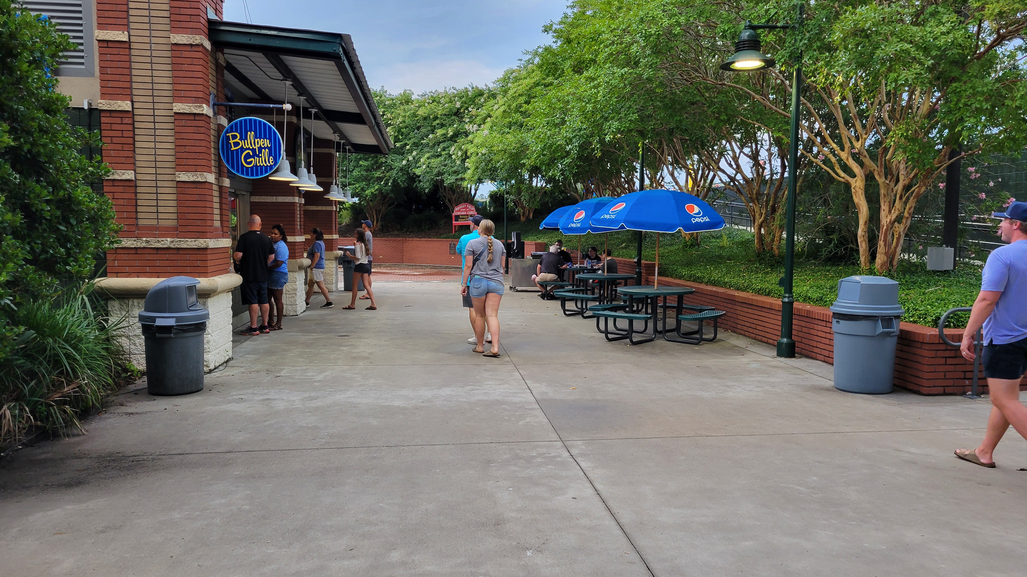 While much of the concourse is behind the seating bowl and covered, there are some exposed areas, including those with field views. Back to the main concourse, it is large enough to support the crowds and there is a decent amount of color again, with brick and sea green being the bulk of it. Several TVs around help to keep tabs on the game. On the sides, the main concourse is a little disjointed as to reach the seating area, ramps/stairs are needed and things can jam up on the first base side. Once up here, the corners feature nice spots with open tables and concession stands, all connecting seamlessly with a middle walkway through the bowl. Left field is also walkable. Other features include a kids play area secluded away from the sun, though maybe filled with bugs with all the greenery around? There’s also a poor attempt at a replica Wrigley Field on the other side. Besides the red marquee, this brick area on concrete is only good for a few minutes of kids going around the basepath.