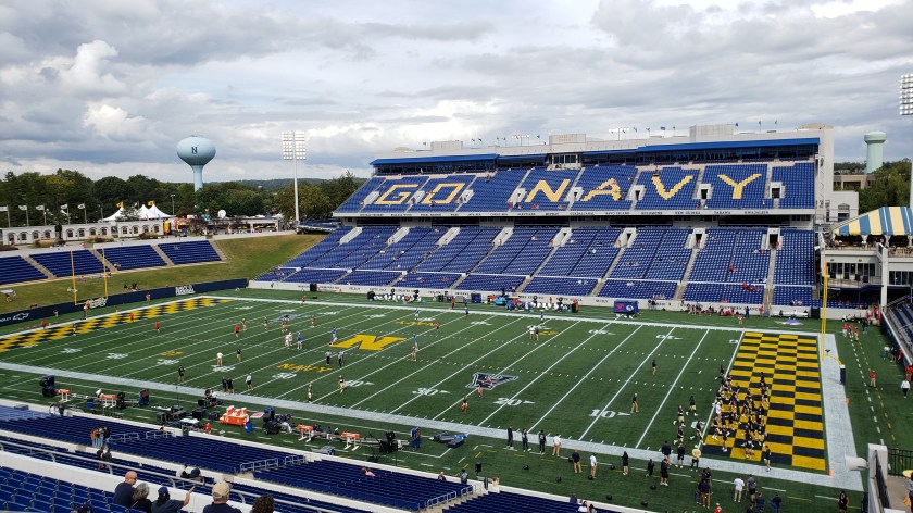 A weekend of football in Maryland began with a bucket list game in the state’s capital. Annapolis is located about 25 miles south of Baltimore, along the Severn River and Chesapeake Bay. The unique location leads to this small city of 40,000 also being known prominently for boating and crabbing. Annapolis also has a ton of preserved history and the tight historic district has so much going for it that it is a must-visit weekend destination for anyone nearby. The US Naval Academy was established here in 1845 as students prepare to become officers in the Navy or Marine Corps. It is a highly selective place and the honorable that attend college here have the entire experience fully funded in return for at least five years in service after graduating with their degree. The football program dates back to the 1800s and includes a national title in 1926. There have been 2 Heisman winners and 23 All-Americans. Under their unique triple-option offense, Navy became a frequent winner again in the Ken Niumatalolo era (though the last few years have been a struggle). Their home stadium was built in 1959 and it is a true memorial to those who have served. Game-day here is something special.