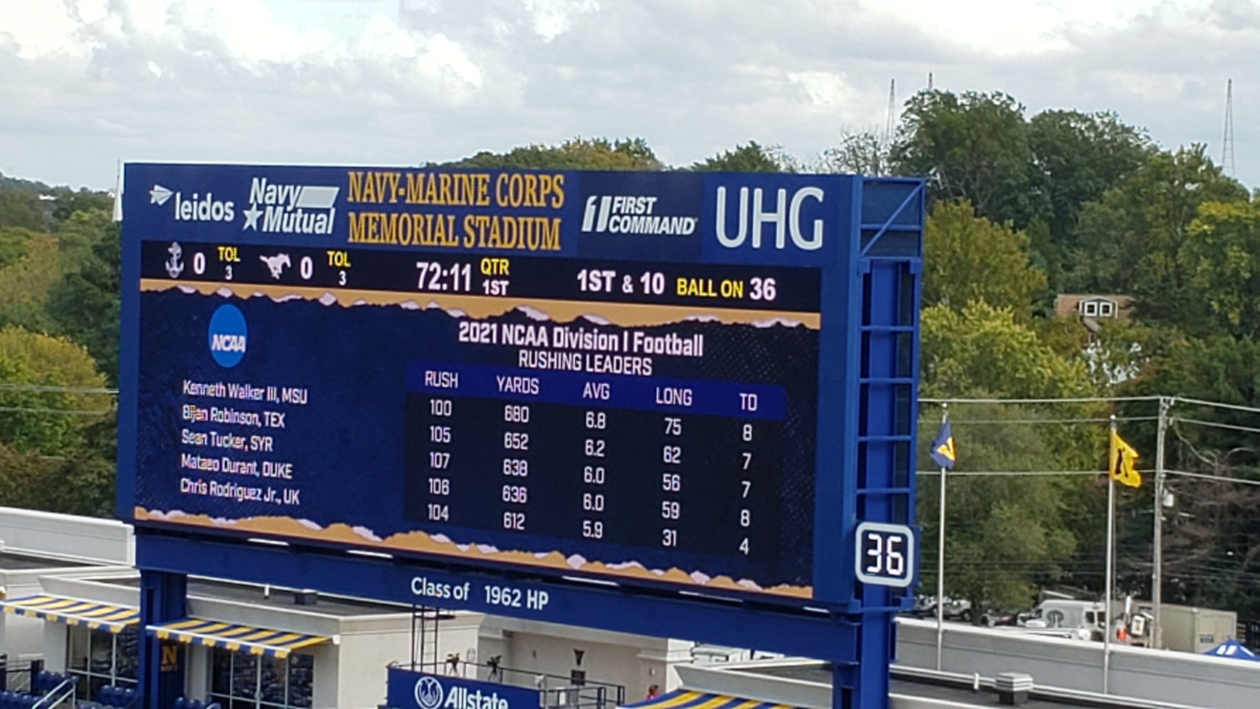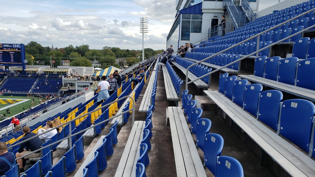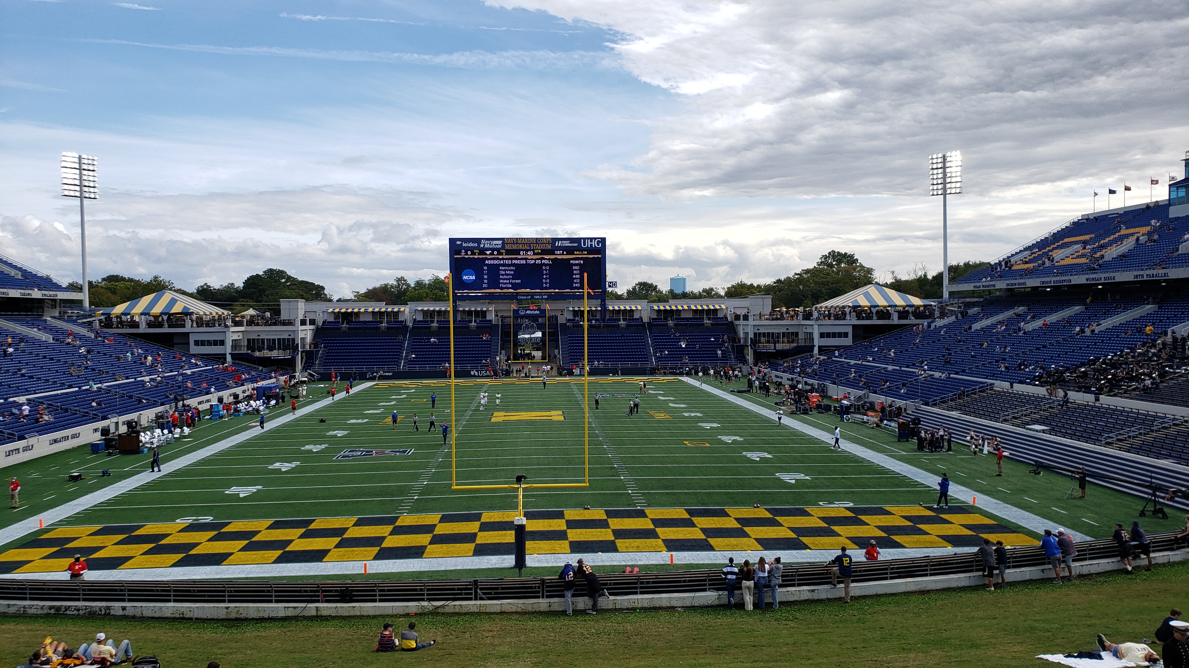 Memorial Stadium is a mix of individual chairs and bleachers with backs and the Navy blue coloring to each seat gives the stadium a really refined, clean look. Plus, the upper deck has gold chairbacks that spell “GO NAVY” when viewed from a distance. Each deck of seating provides a decent vantage point and the steepness of each row is adequate. Spacing is tight though as leg space can be a squeeze. Club-level suites are discreetly tucked between levels and the top of each side also features a set of suites and a triple stacked press box. The grandstands go to each goal line before giving way to end zone seating. A large grassy hill makes up the north end and what makes this unique is that they put nine sections of regular seats at the back of this hill. What a great idea as it’s perfect for parent who wants to sit while keeping an eye on their kids. The other end features a small, but steep set of seating sections, which are topped off by suites. The outside stadium view includes a few peeks at the Capitol building in town and a much more prominent view of the water tower, which has the team logo on it. My only peeve at Navy is the bizarre orientation of the seating numbers. I had Seat 3, figuring I’d be near the aisle. Much to my surprise, I found the seat to be in the middle and was totally confused searching for it while coming up the stairs. My section went like this for seat numbers: 16 –> 1, 25 –> 18. To avoid the sun, sit on the West side (Navy’s sideline).