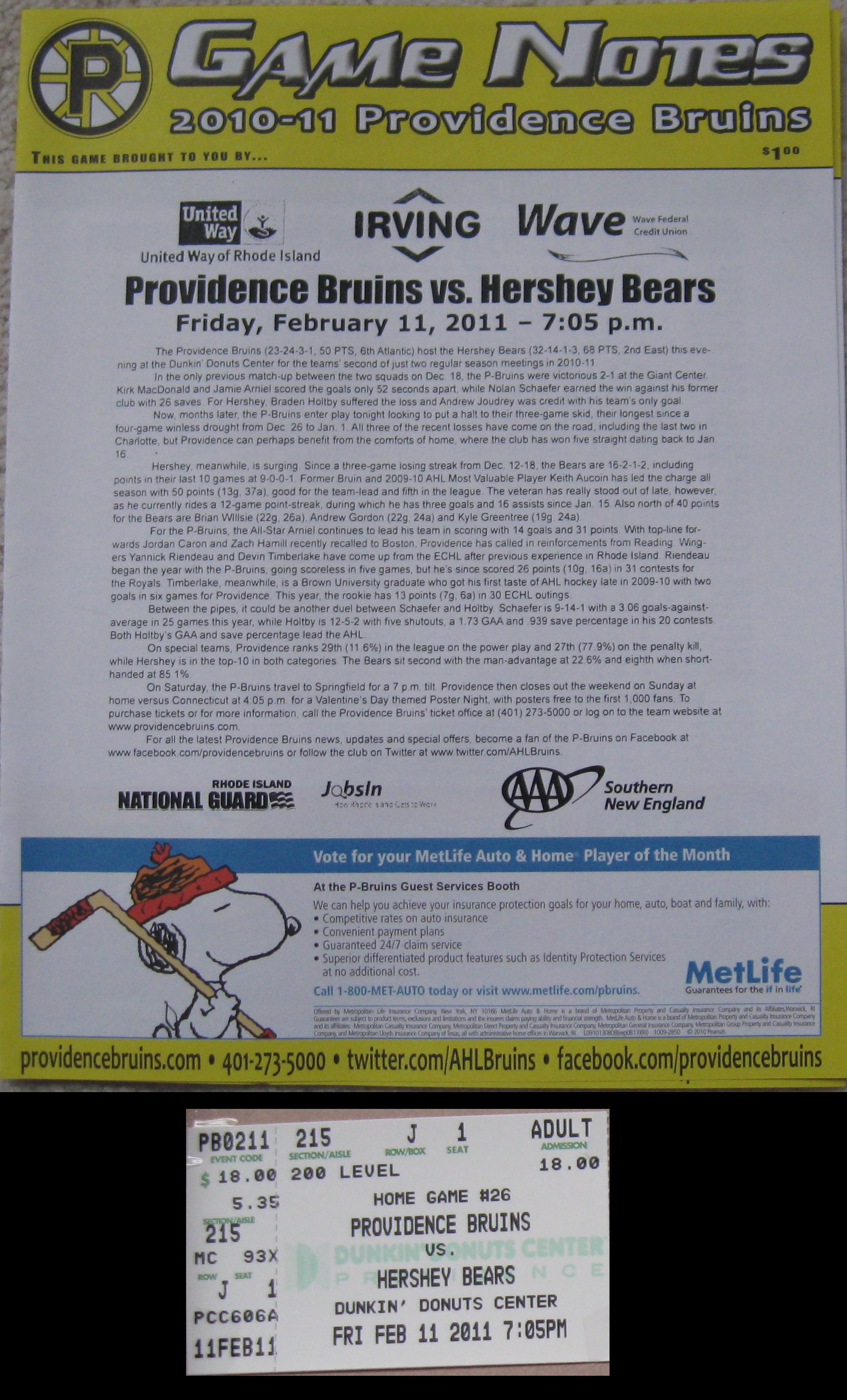 In the game, Hershey’s precision on odd-man rushes and breakaways allowed them to beat the Bruins 4-3. The Bears jumped out to a 2-0 lead and then the game went back and forth as Providence kept cutting the lead to one. The killer goal was from Keith Aucoin as he picked up a loose puck and scored on a breakaway with 5 seconds left in the second period to go up 4-2. Providence scored one in the third and then had a 6 on 4 for the last 1:10 of the game, but could not convert several good chances and ended up losing by one. The Bruins peppered the Bears as they outshot them 22-6 in the final two periods. Boyd Kane of Hershey had two goals.