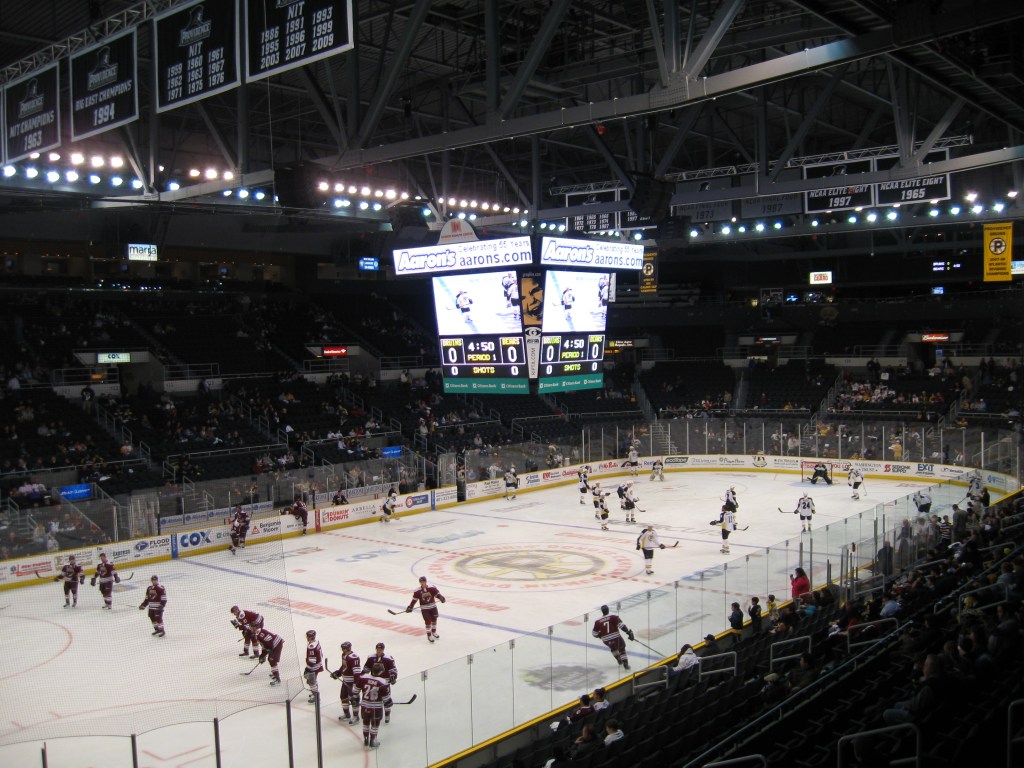 The atmosphere for the game I attended was much more reminiscent of minor-league baseball with a ton of families and kids. There was a lot of general buzz or talking during play and I heard almost no applause for the non-big plays (killing off a penalty, making a big save). Also, the amount of people (mainly parents with kids) walking up and down the aisles during play was ridiculous. It really led to an annoying viewing experience. At least it was nice to attend a game with a mostly packed house and noise after goals was decent. The common chant here was “Let’s Go Bruins” and the goal horn was the same as the parent B’s.