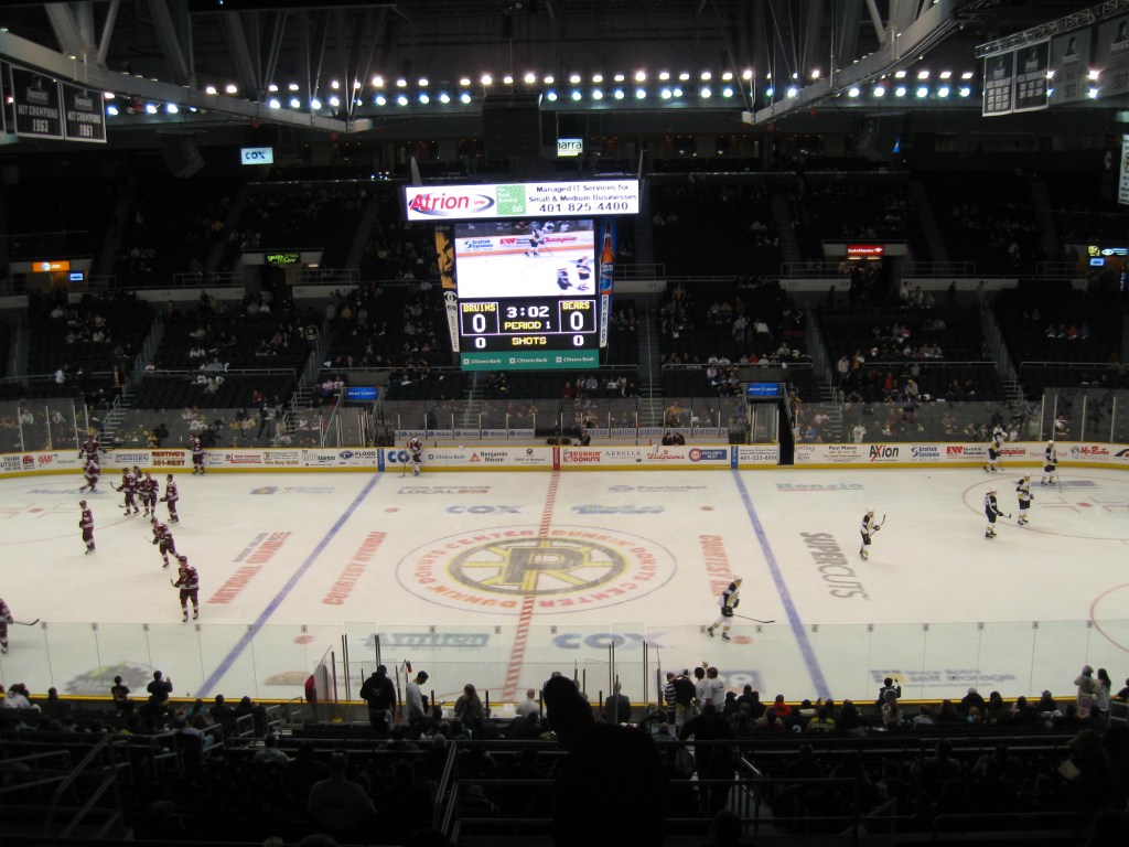 I liked how the building was equal parts Bruins and Friars….One thing I hope they fix are the signs for the sections. For the 200 level, when I was walking up the stairs it said “214”. However, the section was actually “215”, as it said that on the back wall. I looked like a douche as I sat in the wrong seat and thought for sure I was correct. After I moved to the right spot, somebody else came up and did the same thing. Somebody screwed up when putting those signs on….The other thing that needs fixing is the game-day operator. When a Hershey player was hurt badly on the ice (so bad, a stretcher was brought out), they decided to have the fan-cam up as fans were cheering with dance/pop music blaring. C’mon man.