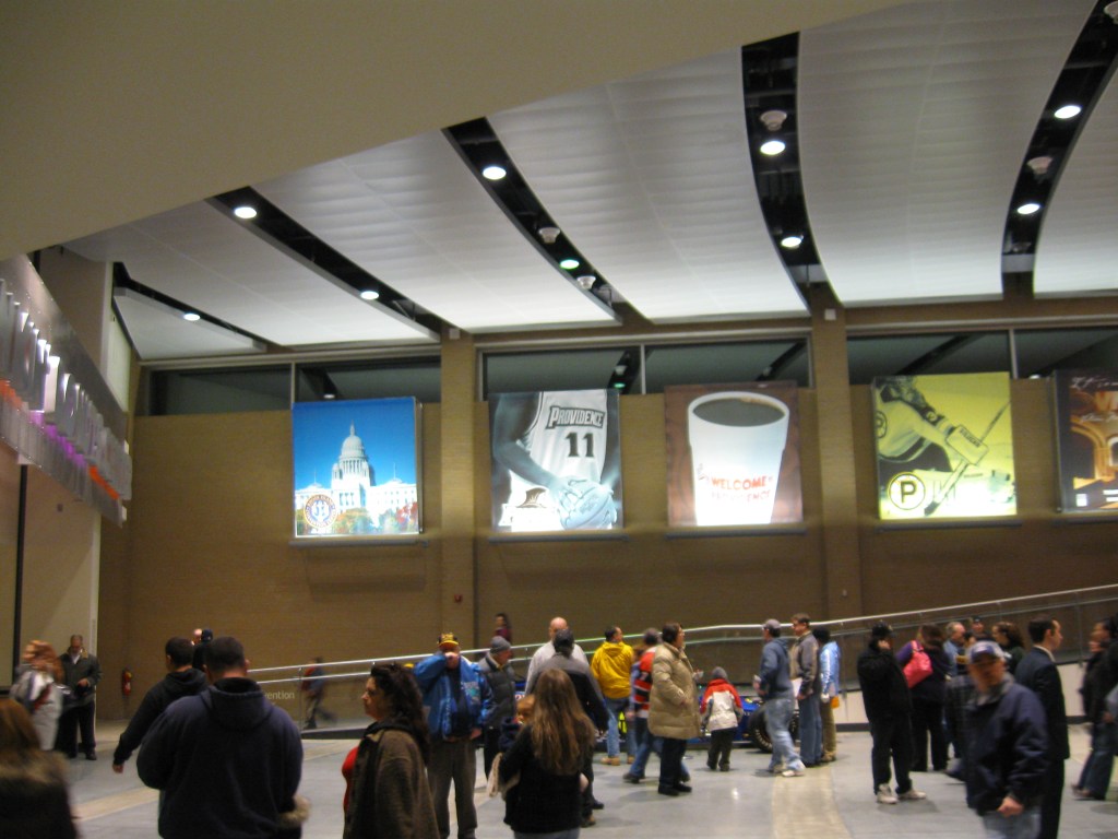 Fans enter into a wide open main foyer, which includes the box office and places to congregate. The arena name is written out before entering and on the walls are pictures related to the arena and area. It’s a good and spacious entryway before getting to a tighter concourse. At least this space is inviting in terms of bright colors, plus it wraps around the entire building. There are a couple spots on the sides where food stands are set further back allowing for more space. The team store for both the Bruins and Friars is near the main entrance.