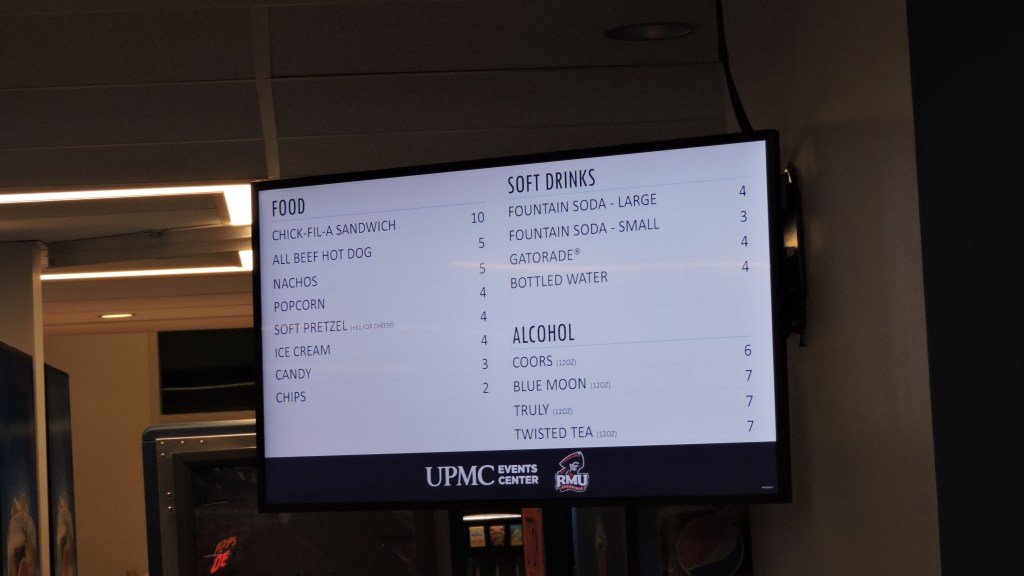 I went into this game with a little bit of negative connotations because of what RMU unnecessarily did to their hockey program (they are bringing it back, but damage was done). I put that aside, ready for a great experience….and that ended when I went through the front door. The security lady told me no backpacks. OK, the sign in front of her said bags 12x12x12 were permitted, it just needed to be searched. She proceeded to tell me that’s for purses, which clearly wasn’t on the sign she was pointing at. Fine, I’ll bring it back to the car, but next up is the camera I’m carrying. There is no detachable lens, but she decides to pull out her ‘guide’ looking for a way to tell me not to bring it in. Now that this was getting ridiculous, I actually had a media credential for this game (the collected ticket stub pictured at the top of the page was found on the floor). Note: I avoid credentials, because I just want a ticket so that I only get the fan experience. But if that’s the only option, I’ll take it. Well, now that she was informed I had a media credential to pick up at Will Call, her whole demeanor changed. Instead of me being a lowly fan….I’m now SOMEBODY. What a crotchety old woman trying to get the most out of her position. As Roger Bennett would say…”It. Would. Get. Worse”. I’m now in the lobby taking pictures, with my media credential around my neck mind you, and some building worker comes up to me and says “Who are you with?” I explain and she gives me a negative tone and negative look as to why I’m taking pictures. She asks my name (having me spell it out), the name of the person that gave me the credential and if I’ll be photographing students. After offering her to show her my website, she walks away all annoyed that she wasn’t “notified” of me. In all my years of visits, which include nearly 250 stadiums, I’ve never been quizzed and looked down upon for photographing a building (and this was with a credential!). I understand it’s odd and certainly don’t mind explaining what I’m doing to somebody. But instead of feeling welcomed after that, I felt like I was intruding. RMU, I am not a fan.