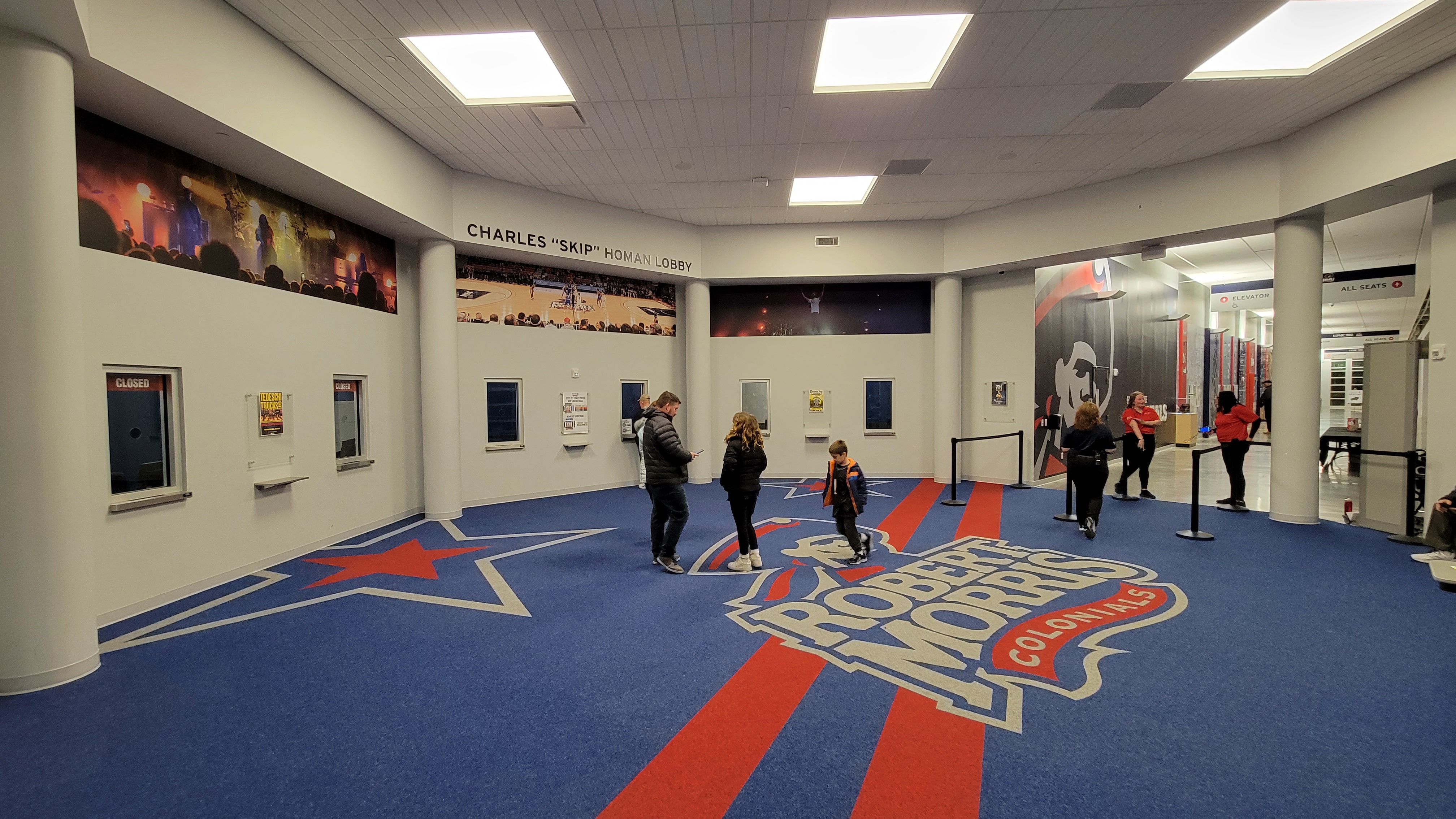 The opening circular atrium is nice, but the placement of metal directors a foot or two away past the doors makes for a crammed start. Otherwise, the lobby has a striking look thanks to the blue and red carpet with the giant RMU logo in the middle. To the right, is a wide hallway full of displays before you reach the stairs (or elevator) to the second level and access to the main arena. Another sideline walkway greets you with great character incorporated around pictures and a huge block lettering of “Colonial Pride”. Space to roam is not an issue here and the aforementioned rotunda is a nice little hang out space as well (especially for the kids as they can sit on a giant foam chair). Bathrooms are adequate. A middle walkway inside the gym leads to easy seat access throughout.