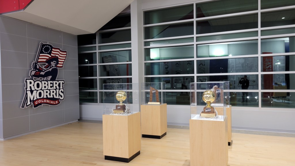 The way that RMU presents their team displays is unique and diversified. The lower-level entryway has timeline of team history that is quite modern. This is followed by a Hall of Fame and then championship information along with some memorabilia. On the other side are the trophies from conference winning teams. Multiple sections of the arena are named after a person and an adjoining plaque gives some nice info about that individual. Inside the arena, the walls continue with honors. The way they present championship years is nice and organized for Men, Women and the Volleyball teams. Three numbers are retired on an opposite wall.