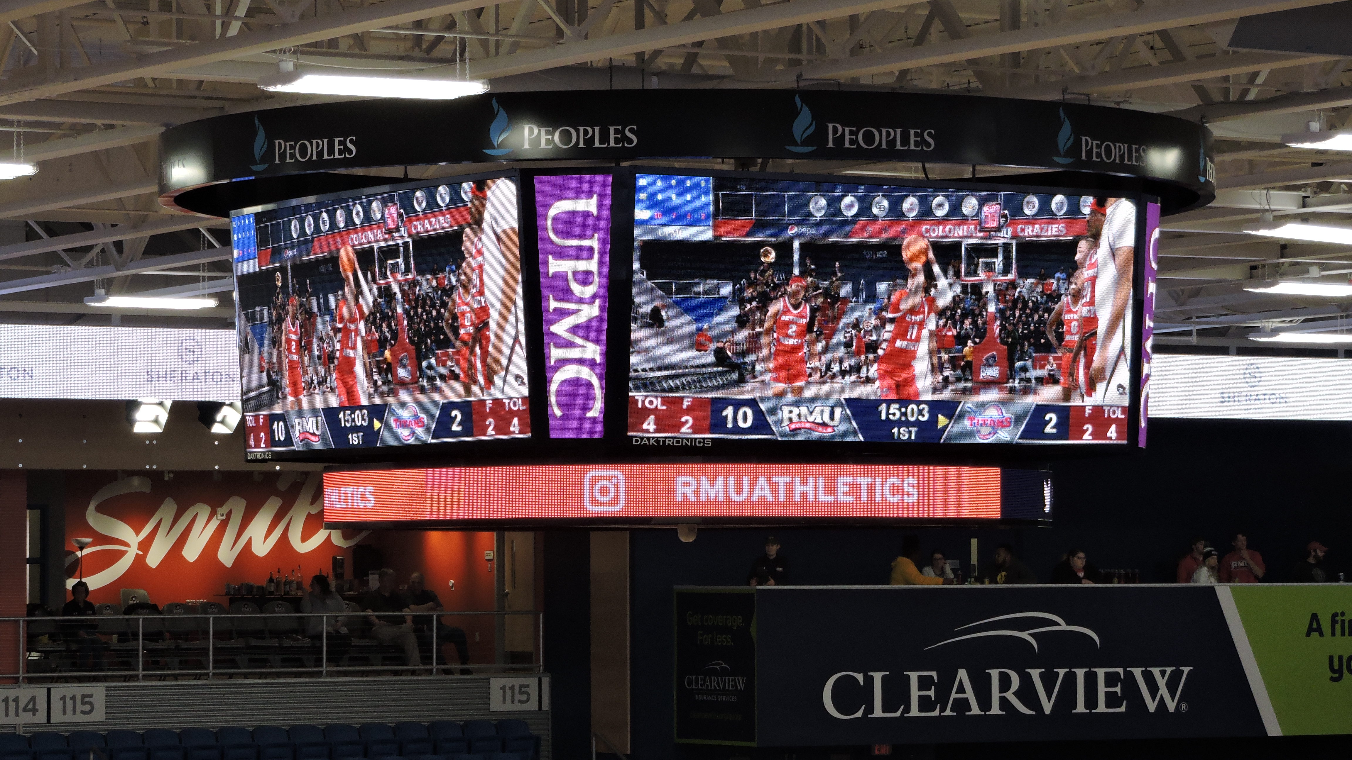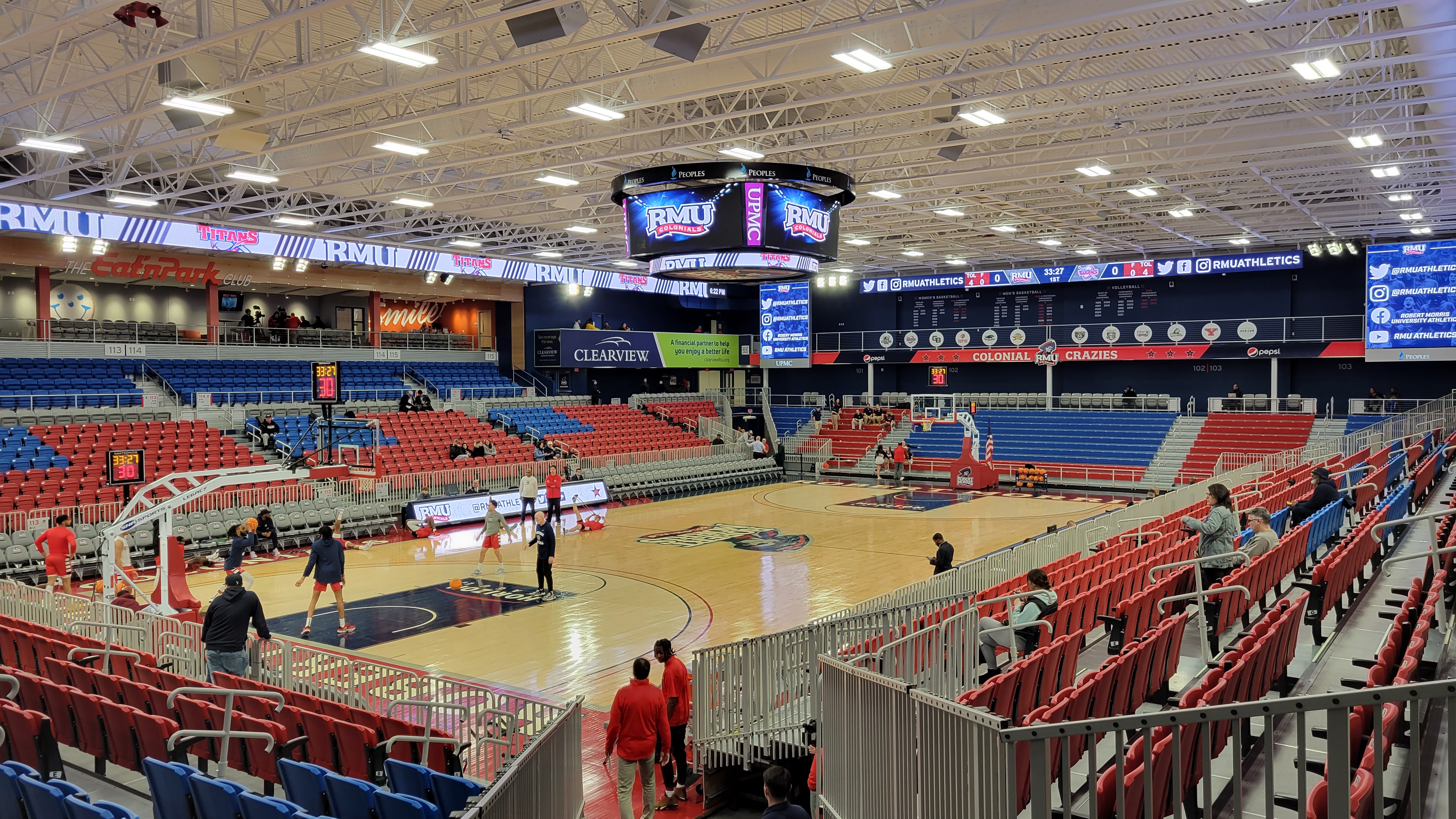 With Pittsburgh’s pro teams and two other larger schools (Pitt and Duquesne) in the area, it’s certainly difficult for RMU to make in-roads. Attendance is not great as the team is just about last in the Horizon League with tickets distributed averaging 1,000 or less. The crowd on-hand for the Friday Night contest that I attended estimated around 700 people. Things were even worse when I watched the feed of their next home game with only a couple hundred filling the vast amount of otherwise empty seats. Even a Quarterfinal or Semifinal Conference Tournament game won’t fill half the building. Student turnout in the “Colonial Crazies” section isn’t terrible as there’s about a dozen who stand and chant/cheer much of the time with a spattering of other students further back in the area.