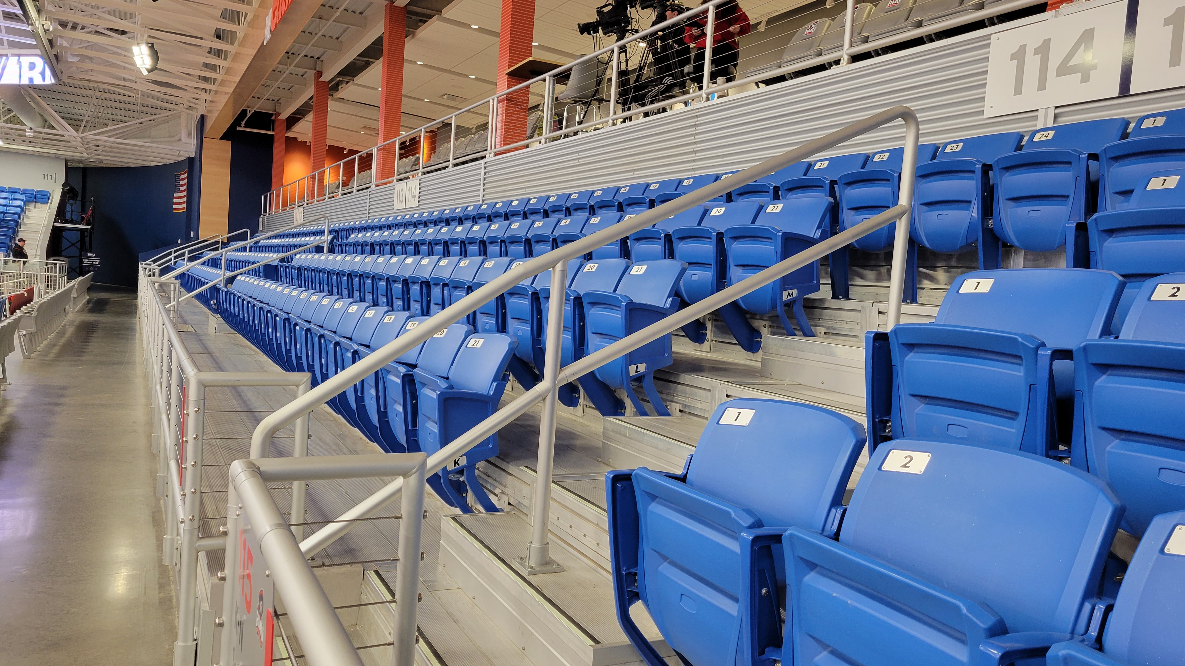 When I first walked in, I had a couple of instant reactions. The first was that it felt like it was a “wide” arena. Some seating structures are vertical, providing better sightlines. Here, seating seemed to go out more horizontal upon initial glance. The other reaction I had was the great character. Lots of blue and lots of red with a fair amount of school spirit. The red and blue seats really stood out and the lower sections in an attempted color design of the American Flag was an interesting visual (and a cheap pop….’Merica). Seating structure features four sides of straight-across rows. On the sidelines, this leads to a few poor angles as seats go well beyond the baseline (facing straight ahead). A walkway in the middle splits sections into two, except behind the student section end. Everything is on an aluminum base and in addition to cheapening the place, the rows in the upper sections are really tight. I was scrunched in my seat and my knees jammed up against the seat in front of me. Lower sections have a little more room. As mentioned before, sightlines could be better (especially if someone is seated in front of you), but it’s a small building and you are altogether close to the court. Luxury sections can be found in multiple areas as there are courtside seats, a club hidden behind Sections 109-11 and the more visible “Eat n Park Club” above 112-116. There are no individual boxes in this club as padded chairs line the front edge.