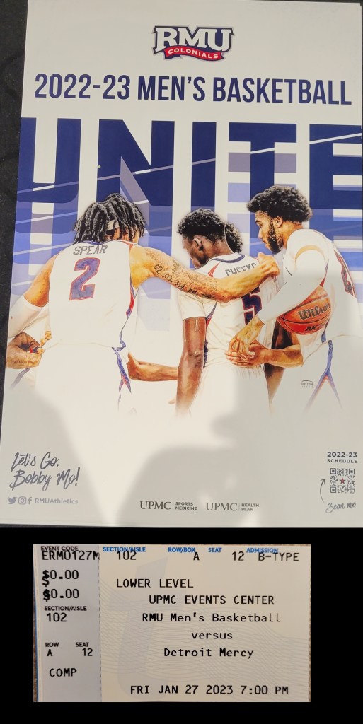 A basketball doubleheader brought me first to Western PA as I began in a suburb west of Pittsburgh. Moon Township has a population of about 27,000 people and along with having some spaced out housing developments, the town is best known for being home to Pittsburgh’s airport and to Robert Morris University. This small private school began as the Pittsburgh School of Accountancy before they took on the name Robert Morris, in honor of the “Financier of the American Revolution”. The Colonials started playing D1 Ball in 1976 and they’ve made the NCAA Tournament eight times, with a 9th appearance getting cancelled in 2020. They took #2 seed Villanova to OT in their 2010 appearance, while their landmark win actually came in the NIT. In 2013, they had the fortune of hosting Kentucky thanks to a building conflict and walked away with a shocking 59-57 win in front of a jam packed Sewall Center. That tiny gym is now gone as the UPMC Events Center opened in 2019 and it is facility with some terrific features. So why the low “Prestige” ranking?….some unpleasant encounters with staff members before the game (see the “Other Stuff” section)