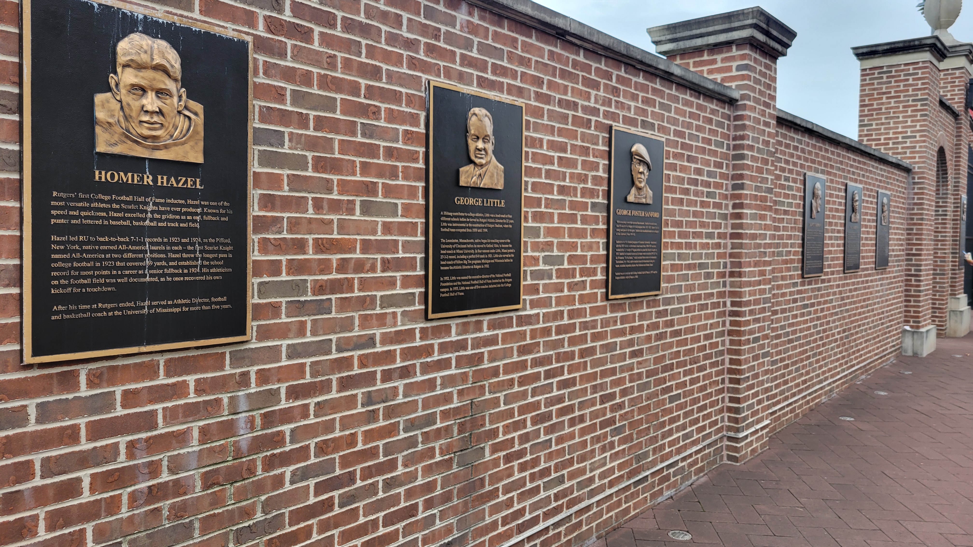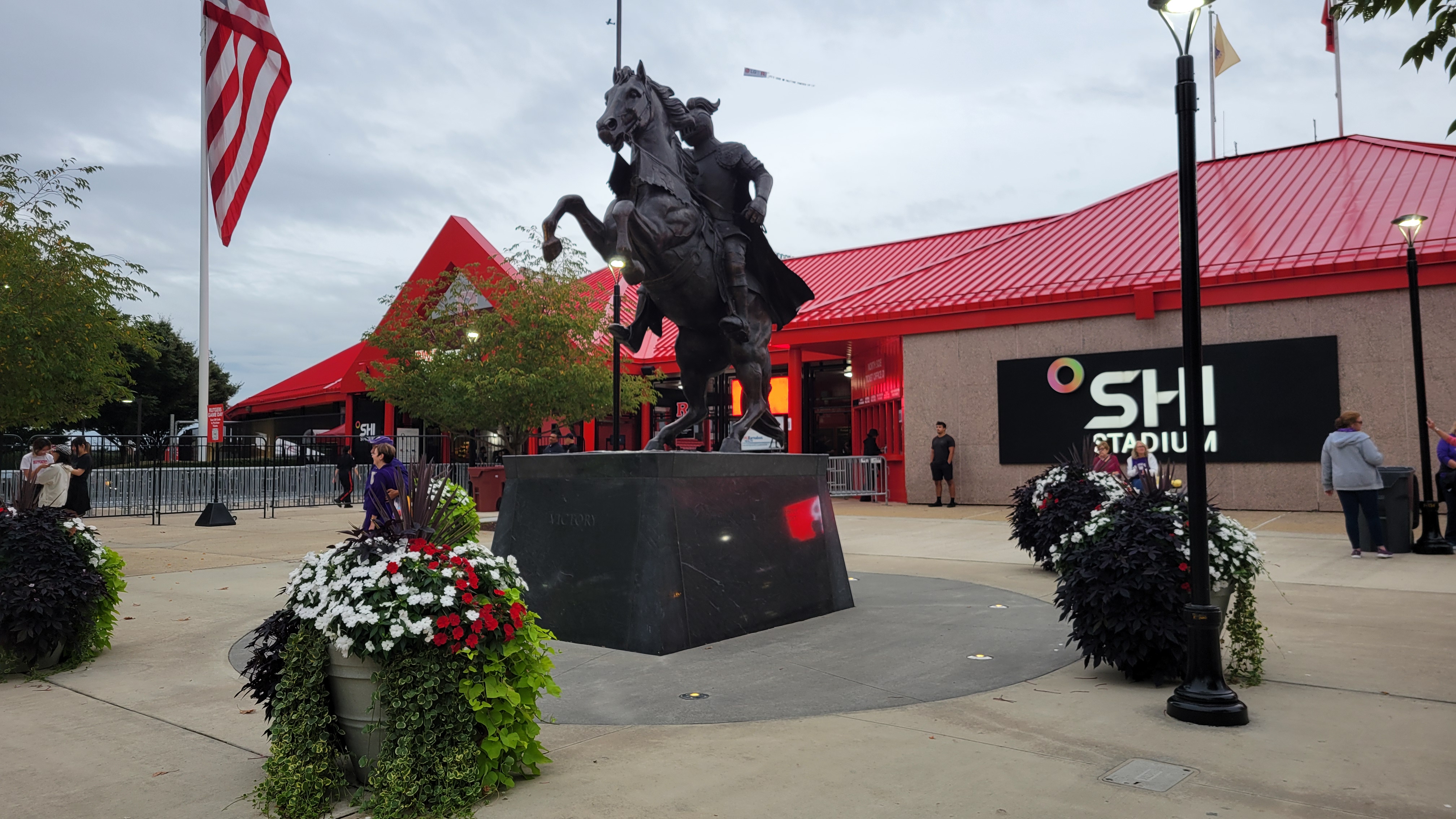 Up on the hill by where I suppose you could say the Main Entrance is, is the “First Game” statue. This honors Rutgers having played in the first college football game with a large bronzed statue of a player. The team walks between the hedges and touches the statue on their way into the stadium. Also in this area is a plaque for Athletic Director Bob Mulcahy. The outside of the stadium is where most of the displays are as the nearby practice field has a wall honoring former top football members, while the entrance grounds has an impressive statue of the horse “Victory” with the Knight riding it. Inside, you’ll see a visual of Rutgers’ alums that have won a Super Bowl title. The lack of bowl appearance displays or anything resembling team achievement is disappointing.