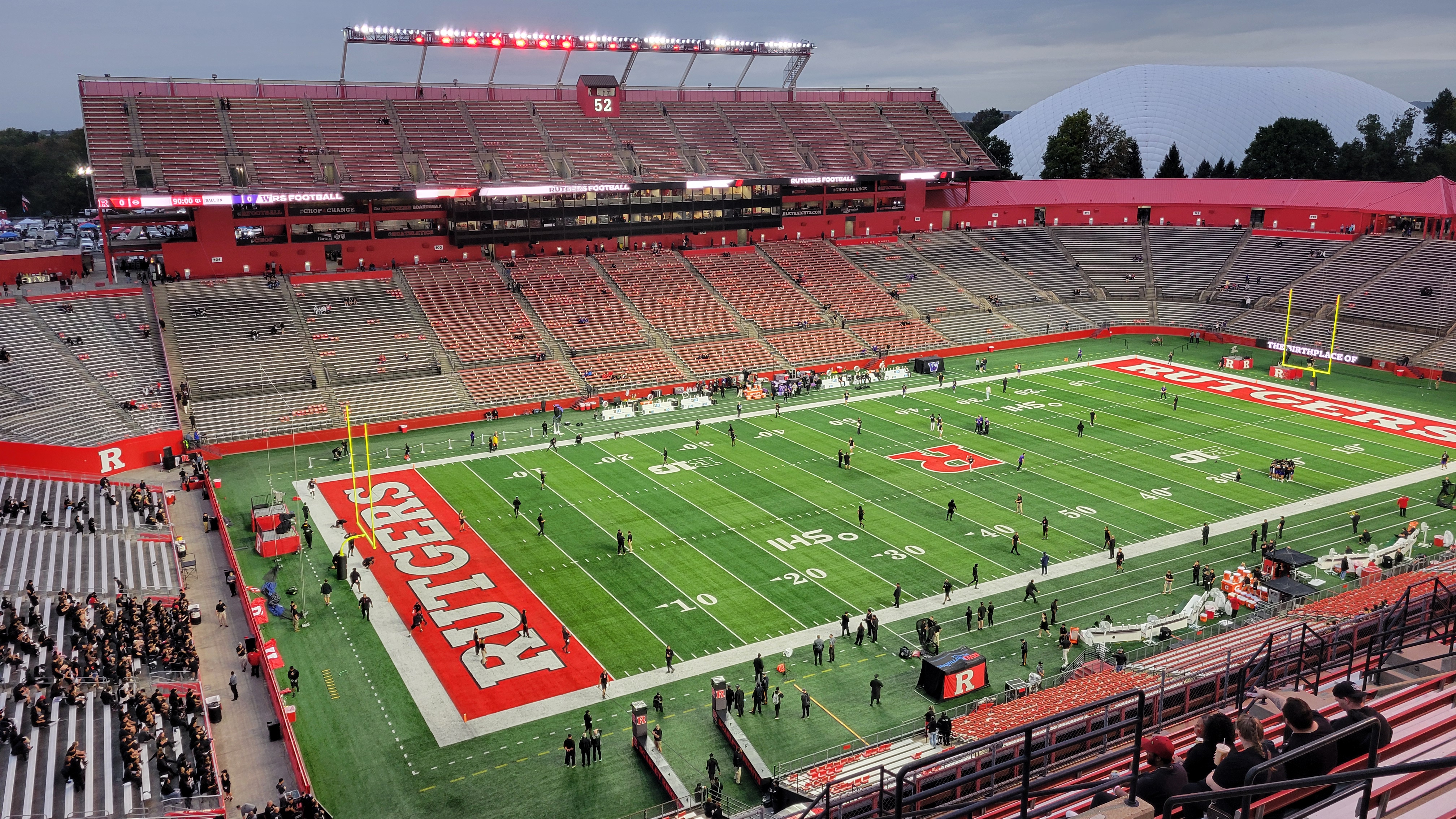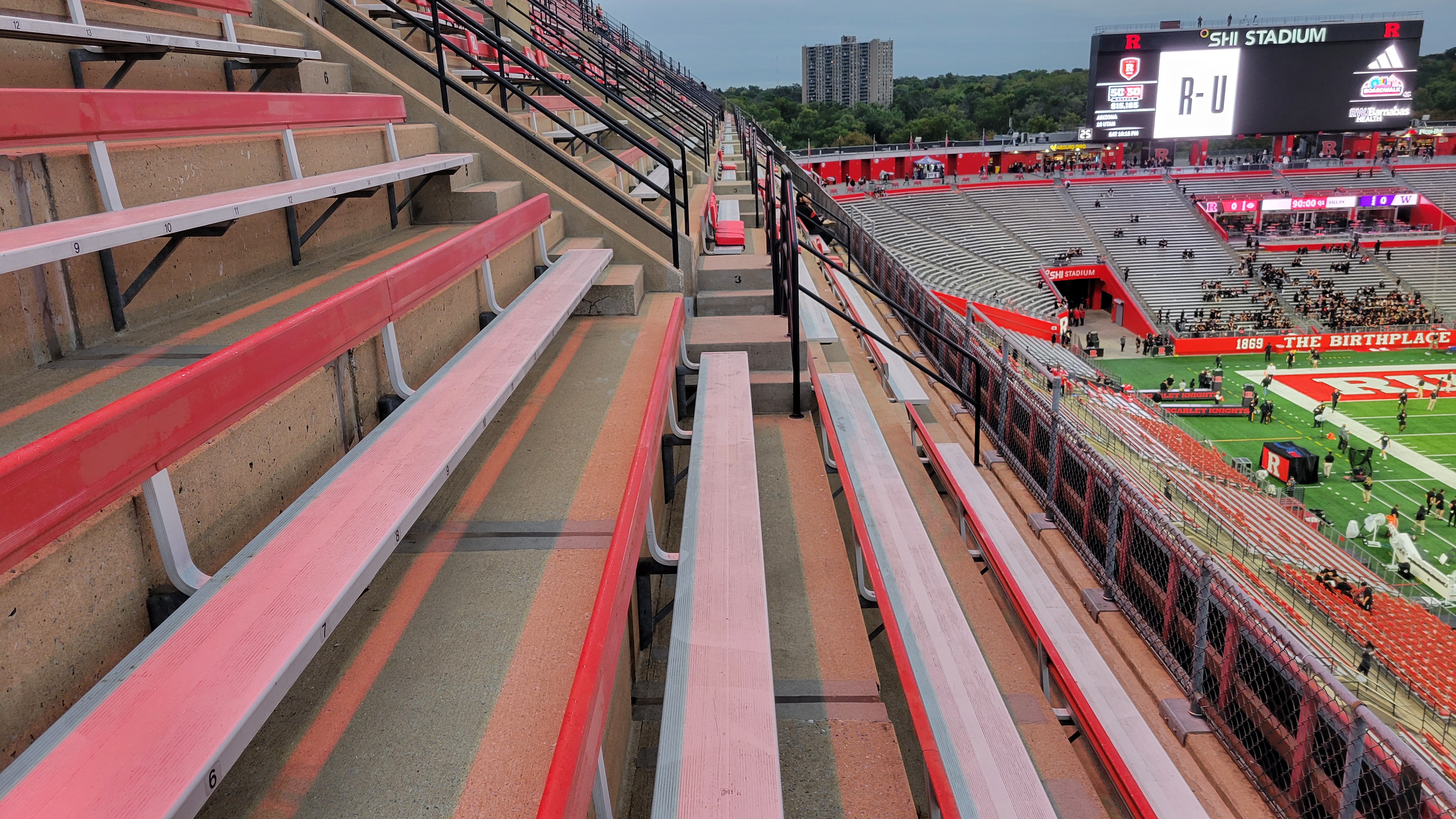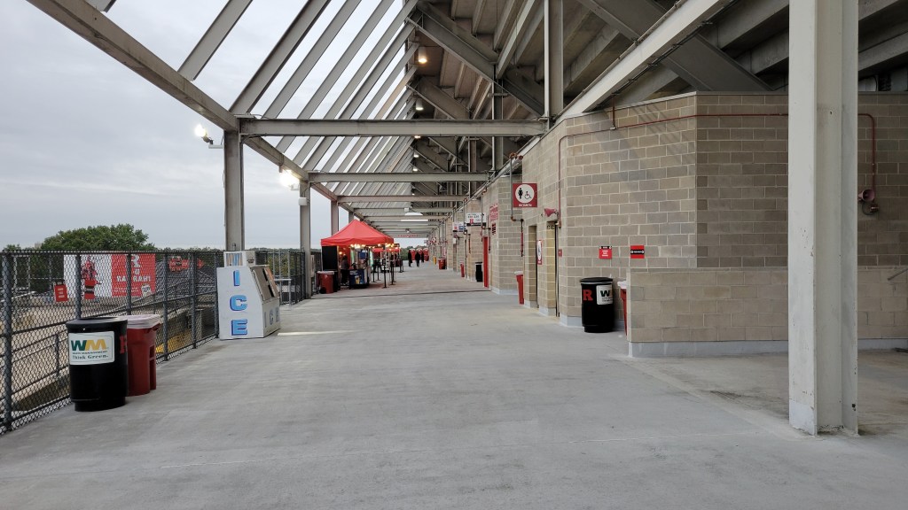Originally, Rutgers Stadium was a horseshoe design with an open, grassy area, however renovations closed off the end zone with seating. The stadium’s first level completely surrounds the field with even amounts of seating. Benches are surprisingly wide and the pitch is of average depth as heads don’t get in the way of the playing field. Students sit/stand in the south end zone and smack dab in the middle of that area is a lounge from the Welcome Center that allows personnel to watch the game with outdoor tables. This is such an odd place for that as it interrupts the student section. Moving to the sidelines, there is no curve to the bowl, leading to several parts of this seating area where if you looked straight ahead, the view was the back of the end zone. Built way up top on the sidelines, is a slightly overhanging second deck. This is a very steep section that runs along the sideline and even though I like an upper deck, these sections are too high and far from the field. The first couple rows also have occasional railing seat obstructions. The height is a result of the press box (on one side) and the Rutgers Stadium Club (other side) being located between the decks of seating. The latter features covered outdoor seating and other inside features, thus making it so big that the upper deck ends up being high. Up top, you can peer outside of the stadium and see the RU practice bubble and an open landscape view on the other side. One thing I love is all the red paint, especially behind the end zones in the back of concourse buildings. It really gives the stadium some character.